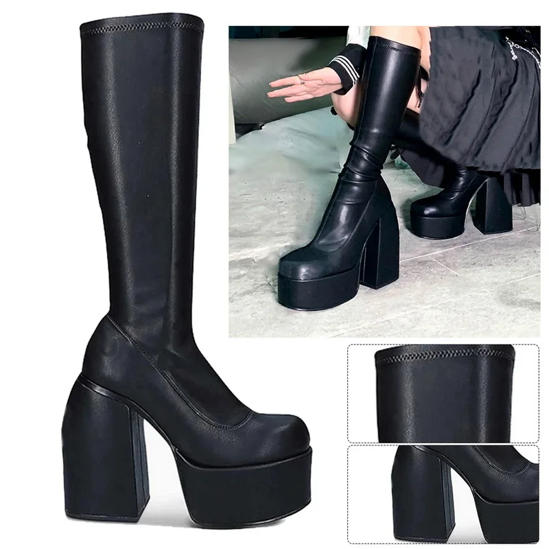 Женские сапоги в стиле панк, черные высокие сапоги до колена из микрофибры, на толстой подошве, на высоком каблуке, осень 2021