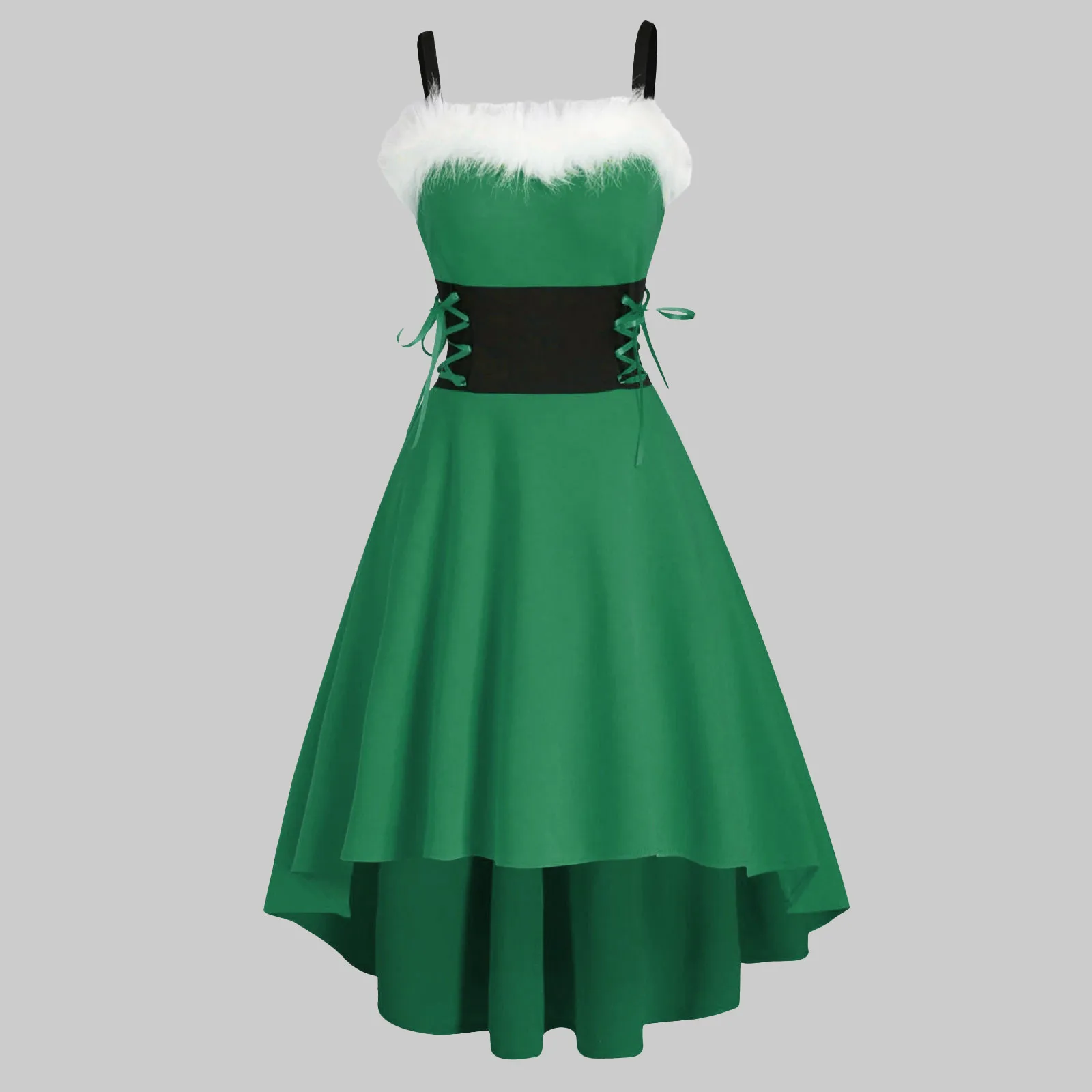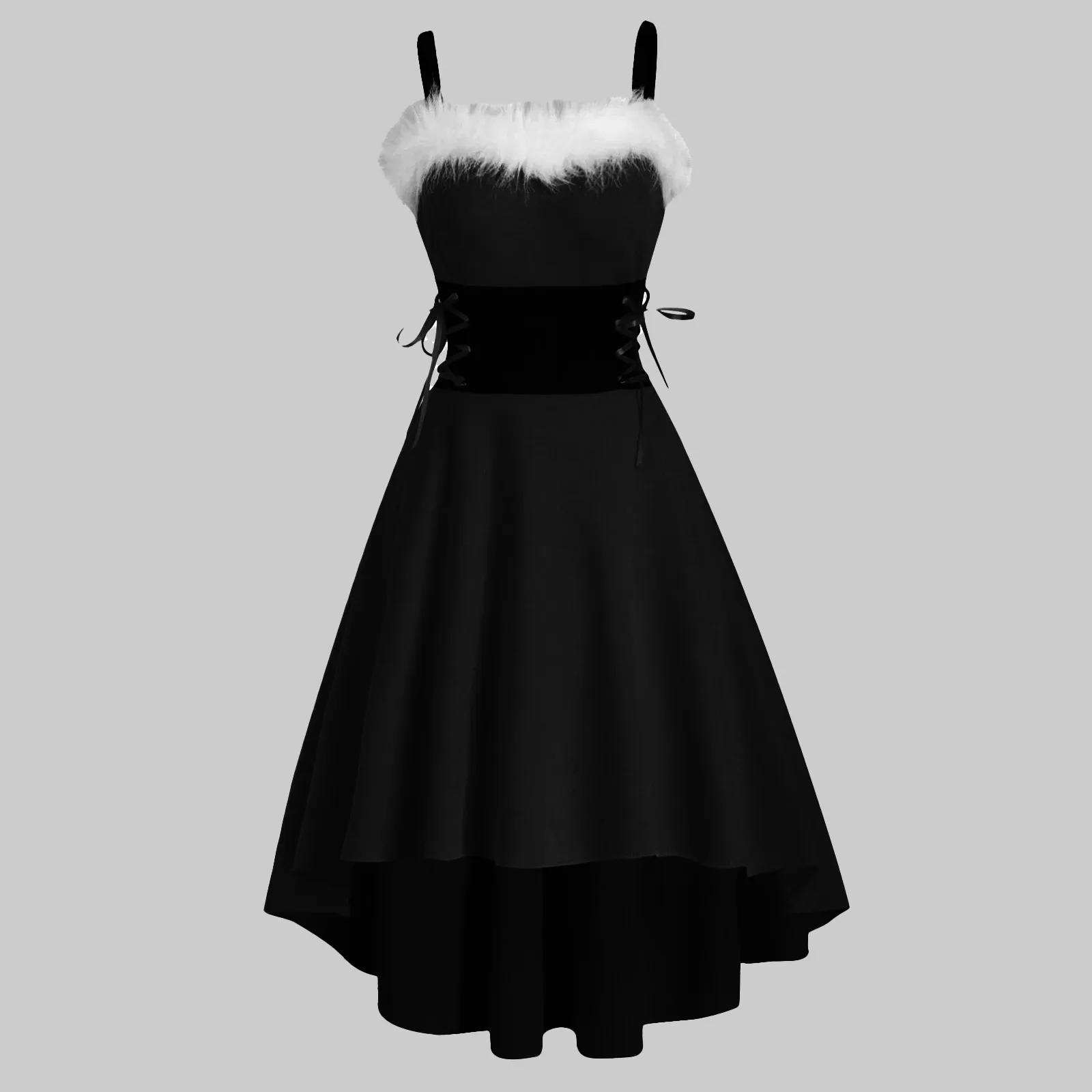 Женское рождественское асимметричное платье миди с открытыми плечами и искусственным мехом на шнуровке