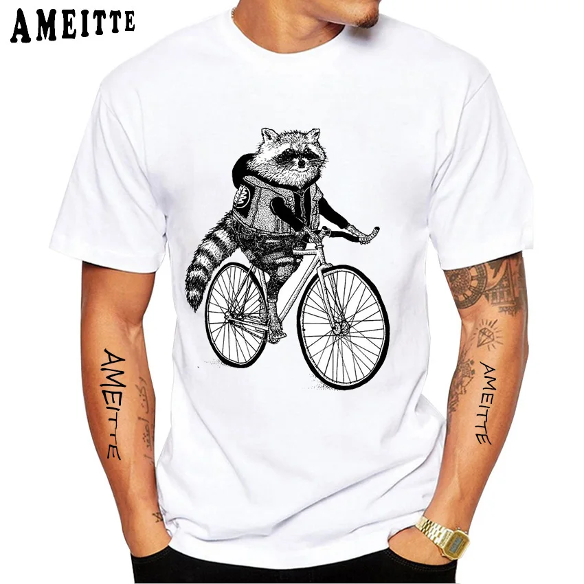 Футболка мужская с коротким рукавом, винтажная тенниска с рисунком енота для езды на велосипеде, повседневный смешной Топ в стиле хип-хоп для мальчиков, белый цвет, летняя