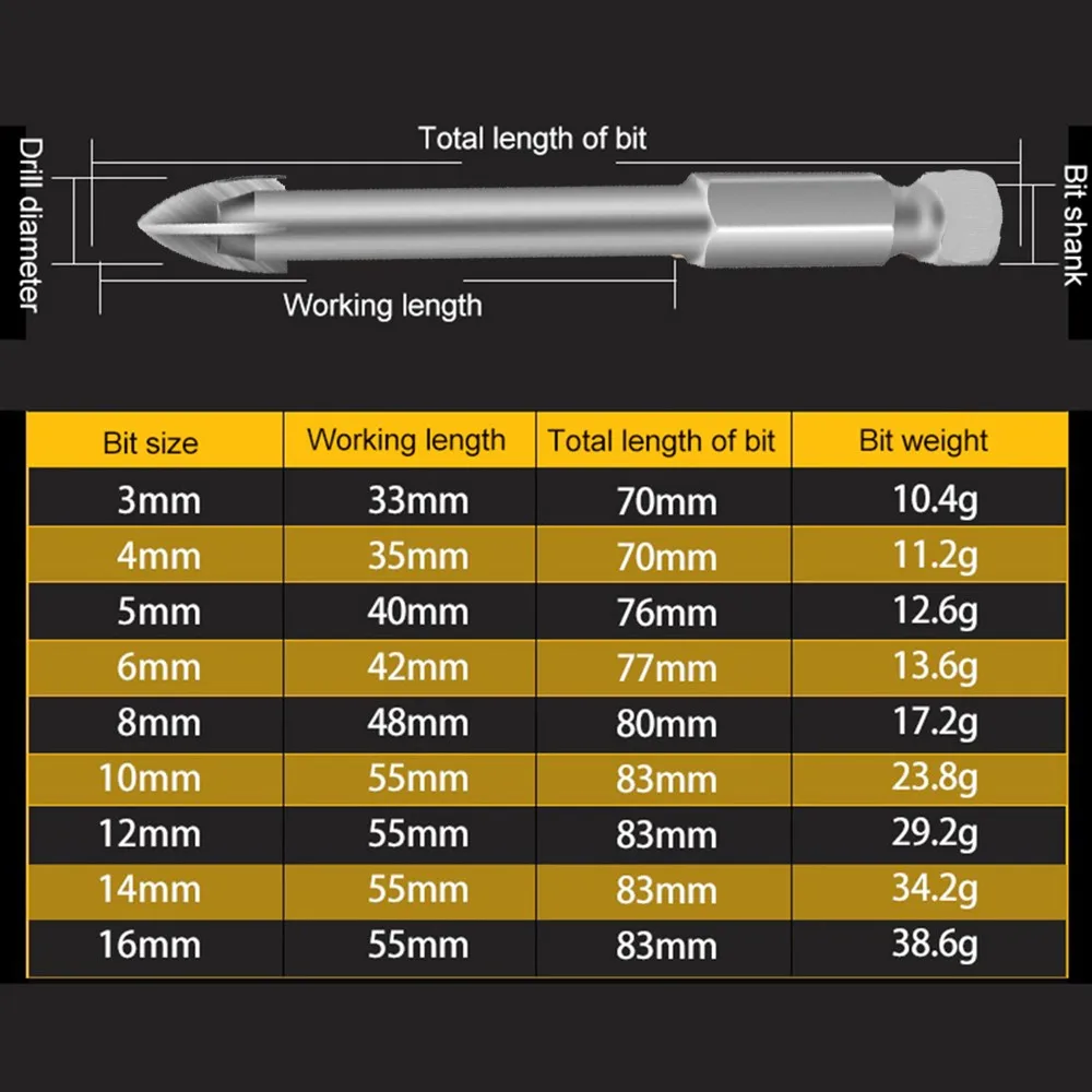 Профессиональные сверла для стекла и плитки обеспечивают плавное и точное сверление керамической плитки, мрамора, тонкой железной пластины, зеркал и стекла. Не забудьте добавить воду или охлаждающую жидкость при сверлении.