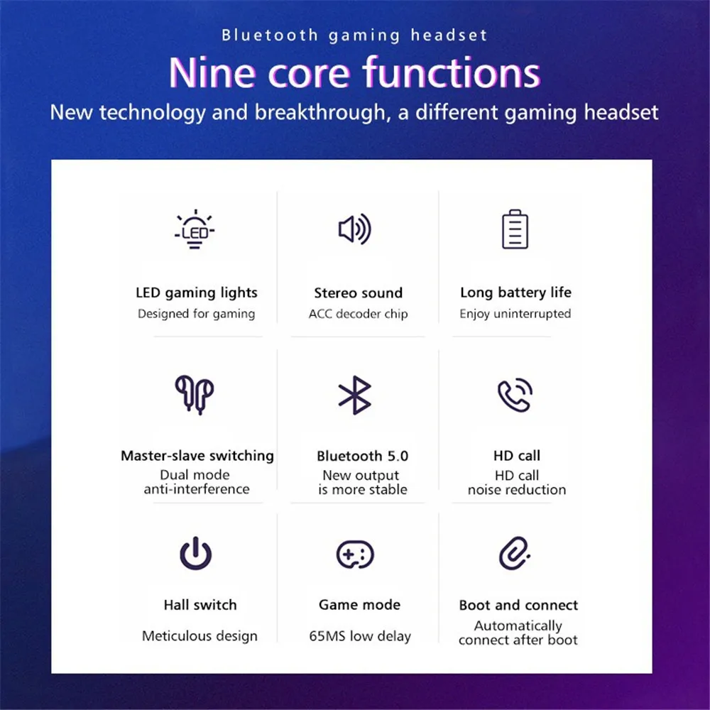 Тип:Игровая гарнитура с низкой задержкой 65msХарактеристики 1: беспроводные наушники, Bluetooth наушники, гарнитуры без рук, TWS Bluetooth наушники, игровые головные уборы, игровые наушникиОсобенность 2: водонепроницаемый, Автоматическое Сопряжение, сенсорное управление, наушники с функцией интеллектуального Шумоподавления Bluetooth 5,1Характеристика 3: 65 мс низкая задержка + длительный срок службы батареи + качество объемного звучания басов + позиционирование звукаФункция: audifonos para celular + auriculares bluetooth inalambricoПереключатель режима: Режим игры/Режим музыки/режим вызоваПосылка включает в себя:1 * TWS bluetooth 5,0 наушники1 * двухинтерфейсная зарядка Type-C3 * пары наушников1 * Руководство пользователя