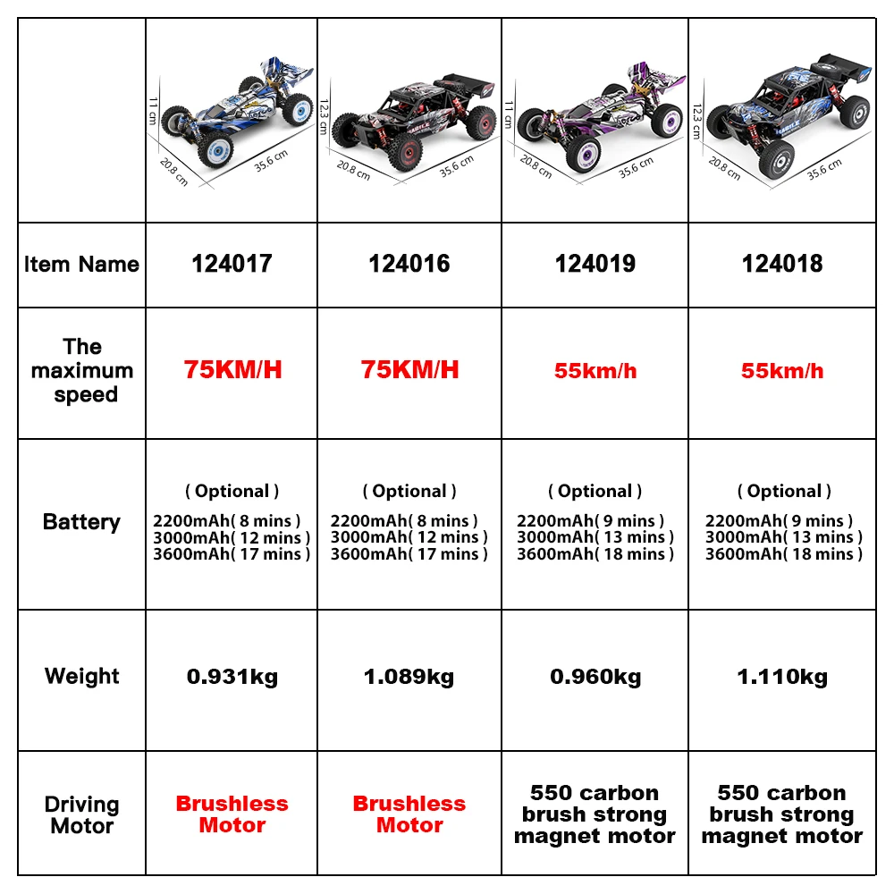 Примечание: Пожалуйста, обратите внимание, чтобы отличить модель перед покупкой заказа. Параметры модели заключаются в следующем:1.Название: 124017 (версия V2)Размер: 45,6*22,7*14,1/1:12Максимальная скорость: 75 км/чАккумулятор: 7,4 В 2200 мАчМотор для вождения: бесщеточный двигатель, магнитный двигательВес: 931 гВремя работы: 8 минутМеталлическое дно: Да2.Название: 124016 (версия V2)Размеры: 35,6*20,8*12,3/1:12Максимальная скорость: 75 км/чАккумулятор: 7,4 В 2200 мАчМотор для вождения: бесщеточный двигательВес: 1089 гВремя работы: 8 минутМеталлическое дно: Да3.Название: 124018Размеры: 35,6*20,8*12,3 см/1:12Максимальная скорость: 55 км/чАккумулятор: 7,4 В 2200 мАчМотор для вождения: 550 углеродных щеток с сильным магнитомВес: 1110 гВремя работы: 9 минутМеталлическое дно: Да4.Название: 124019Размер: 35,6*20,8*11 см/1:12Максимальная скорость: 55 км/чАккумулятор: 7,4 В 2200 мАчМотор для вождения: 550 углеродных щеток с сильным магнитомВес: 960 гВремя работы: 9 минутМеталлическое дно: Да25C 2200mAh Время работы батареи: 9 минут25C 3000 мАч Время работы батареи: 13 минут30C 3600mAh Время работы батареи: 18 минут