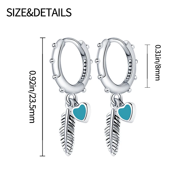 Серьги из серебра 925 пробы с бирюзовым сердечком и перьями, модные...