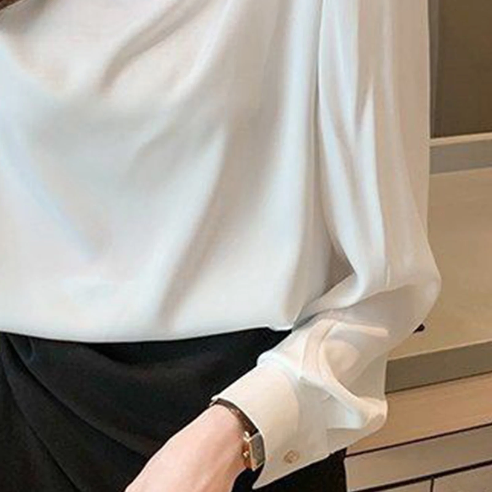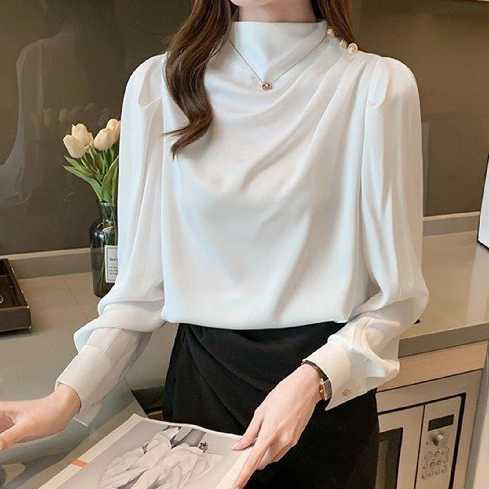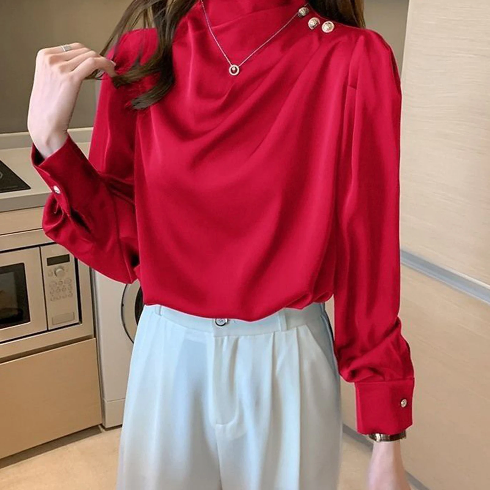 Блузка Женская атласная с пышными рукавами, Офисная рубашка с воротником-стойкой, на пуговицах, голубая белая, весна-лето 2021