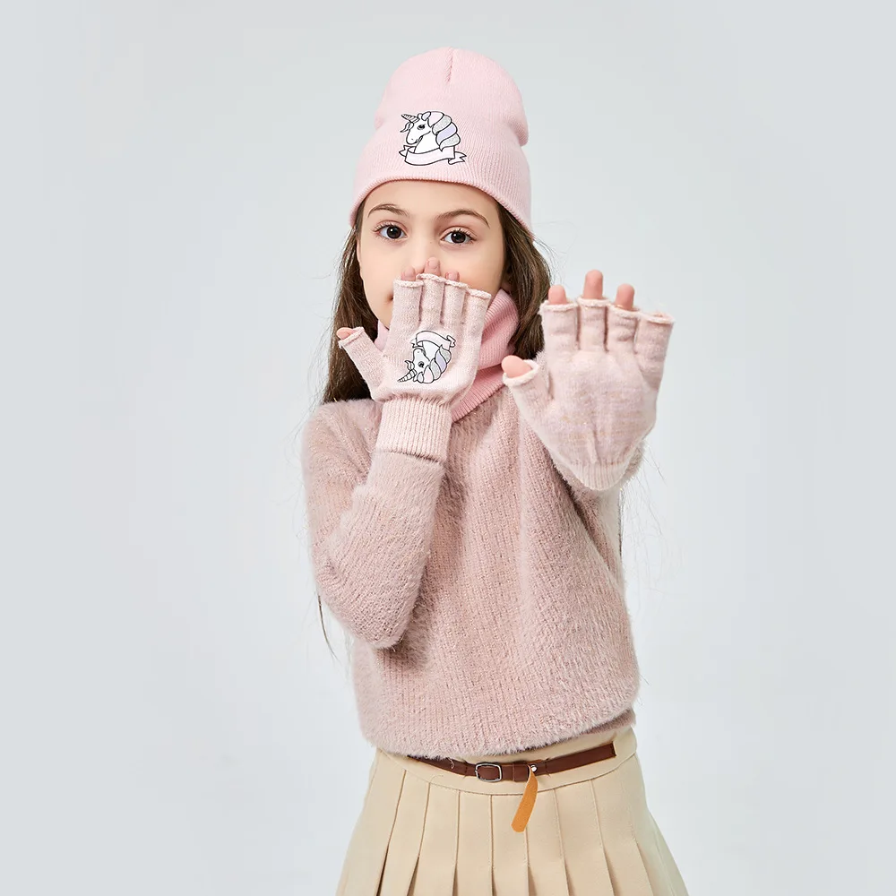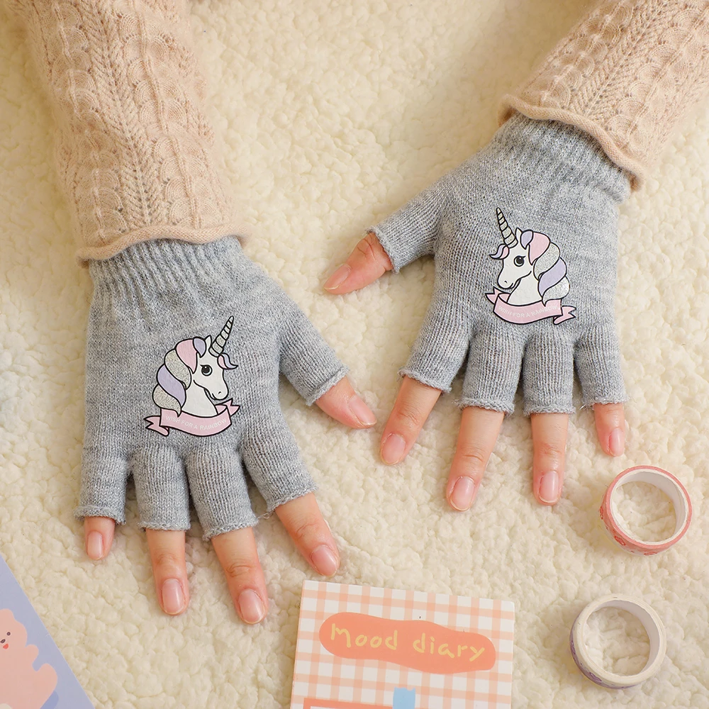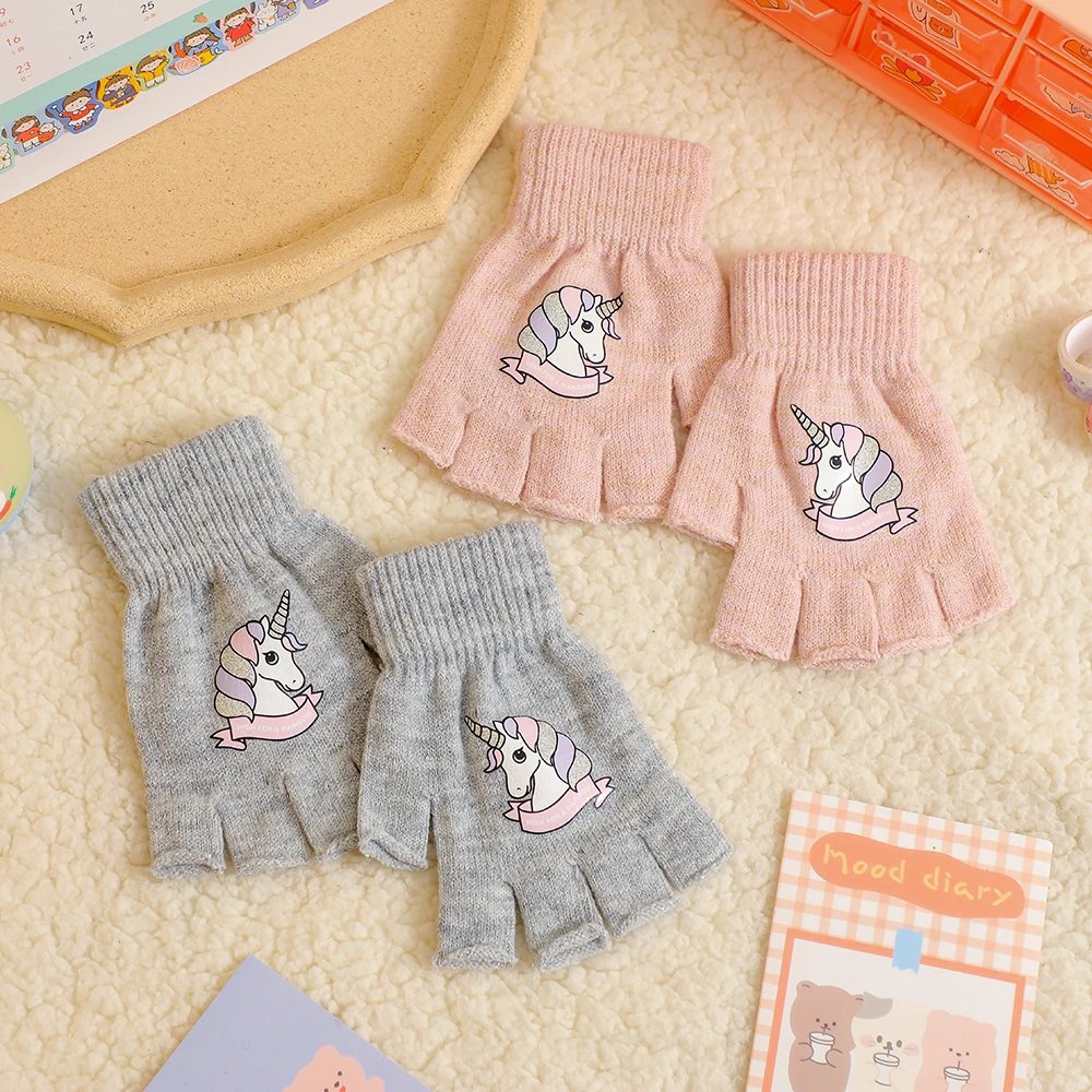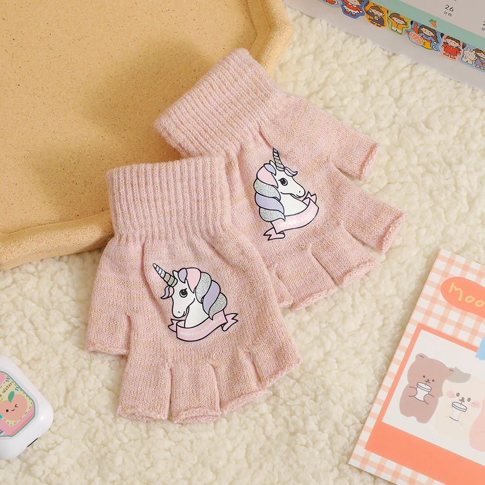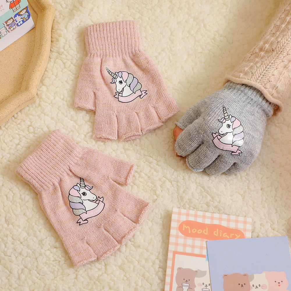 Милые теплые варежки с кроликом, мягкие эластичные вязаные перчатки на полпальца для девочек и мальчиков, милые плюшевые перчатки карамельных цветов с чехлом