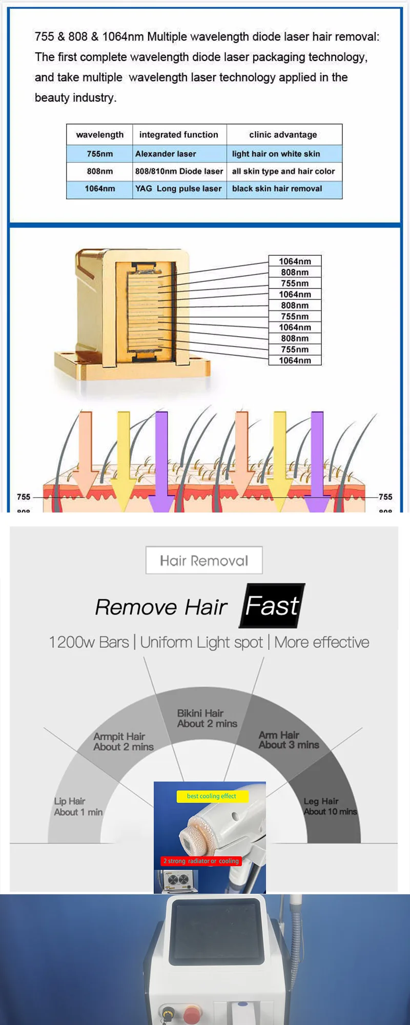 Преимущество:1. Объединить 808nm + 755nm + 1064nm 3 волны диодный лазер в одной машине, может сделать все тип кожи и тип волос удаление волос.
