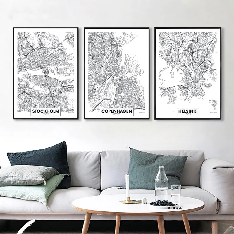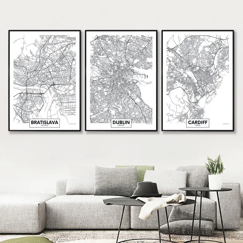 Черно-белая комнатная декорация карта городов мира Холст Картина на стену художественные принты Нидерланды Турция Исландия города плакат декоративная картина
