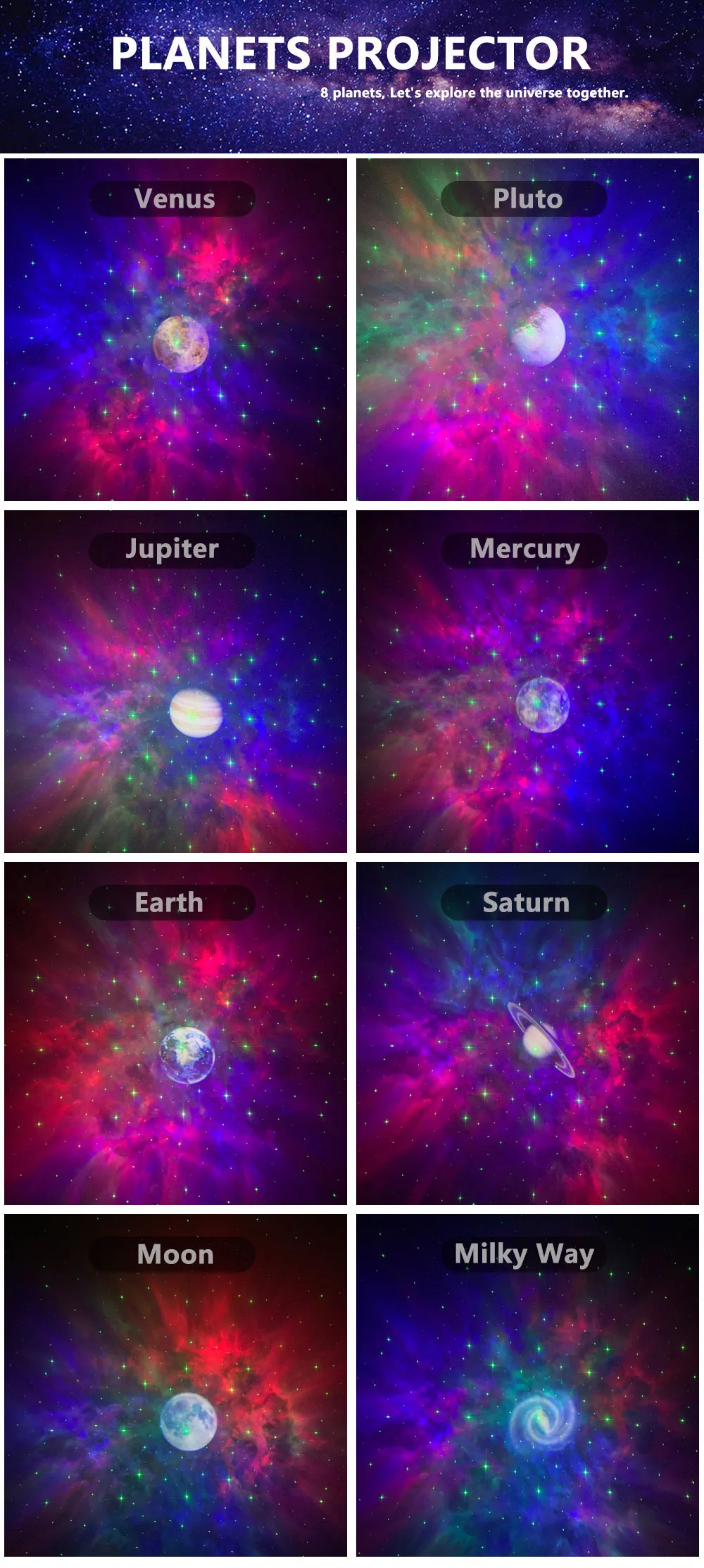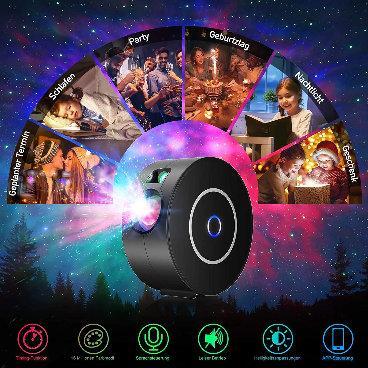 Очень подходит для:Звездный проектор может использоваться как ночной светильник в спальне, как светильник для создания вечерние сцены, как светильник для украшения игровых комнат или для создания атмосферы в домашнем кинотеатре. Вы можете использовать его в вечерние часы, бар или караоке, на Рождество, свадьбу, представление и т. Д.