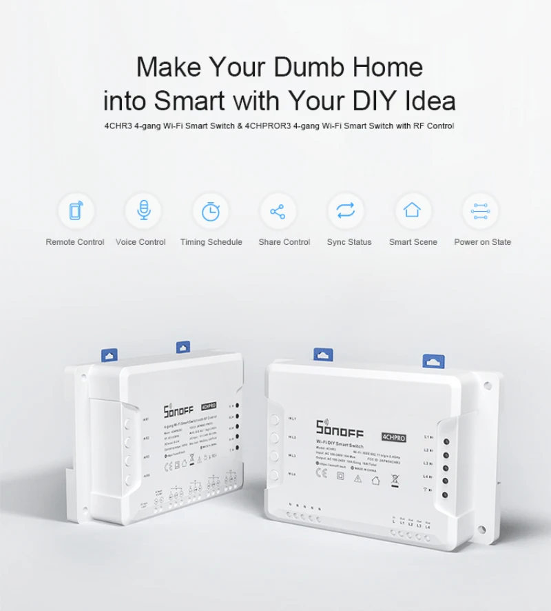 100% новый бренд и высокого качества Sonoff 4CH представляет собой ESP8285 основе 4 канала (4-банда) профиль монтажный переключатель Wi-Fi. Sonoff 4CH поддерживает подключение и управление 4 бытовыми приборами, которые можно включать/выключать отдельно кнопками или iOS и Android APP EweLink. Владение Sonoff 4CH означает, что вы имеете 4 Sonoff basic переключатели WiFi интеграции вместе. Корпус является профиль крепление поддерживается! Din-рейка-это металлическая рейка стандартного типа, широко используемая для монтажных автоматических выключателей и промышленного контрольного оборудования внутри стеллажей оборудования. Эти продукты обычно изготавливаются из холоднокатаной углеродистой стали с оцинкованной или хромированной яркой поверхностью. Sonoff 4CH принадлежит семейству Sonoff, безусловно, он выполняет все функции basic Sonoff. В EweLink вы можете удаленно включать/выключать из любого места в любое время, установить один/повтор/таймер обратного отсчета для включения/выключения в указанное время, делитесь с другими, чтобы они могли контролировать вместе. Sonoff 4CH является хакерским, что вы можете мигать прошивку без проблем. После доступа к Google Nest, e-We Link может получать данные об окружающей среде в реальном времени, такие как температура, влажность от Google Nest, а также проверять, есть ли кто-то дома или нет. Все это может быть использовано для создания умной сцены для управления устройствами Sonoff с поддержкой e-WeLink. Поддержка автономного включения/выключения 4 домашних приборов поддержка управления бытовыми приборами с помощью локальных переключателей или приложений поддержка статуса отслеживания и своевременное дистанционное управление через Приложение Поддержка времени обратного отсчета и синхронизации графика Поддержка обмена одним ключом другие режимы работы пользователя: автофиксацией/шаговым управлением/кирпечей из глины/самоблокирующийся режим регулируемое время для автофиксацией/шаговым управлением режим: 0,16 s Питание: 90-250 В переменного тока (50/60 Гц) /5-24 В DC максимальный ток: 10A/gang Максимальная Мощность: 2200 Вт/gang Цвет: белый Беспроводной Стандартный: Wi-Fi 2,4 ГГц b/g/n, 433 МГц RF механизм безопасности: WEP/WPA-PSK/WPA2-PSK