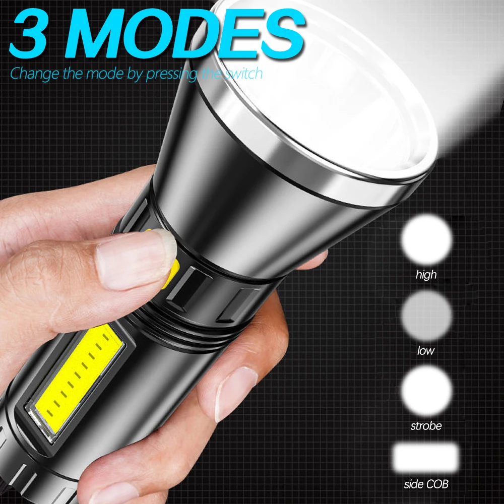 Светодиодный фонарик дальнего радиуса действия 500 м, USB Перезаряжаемый фонарик, водонепроницаемый фонарь с босветильник светом COB, встроенный аккумуляторный кабель