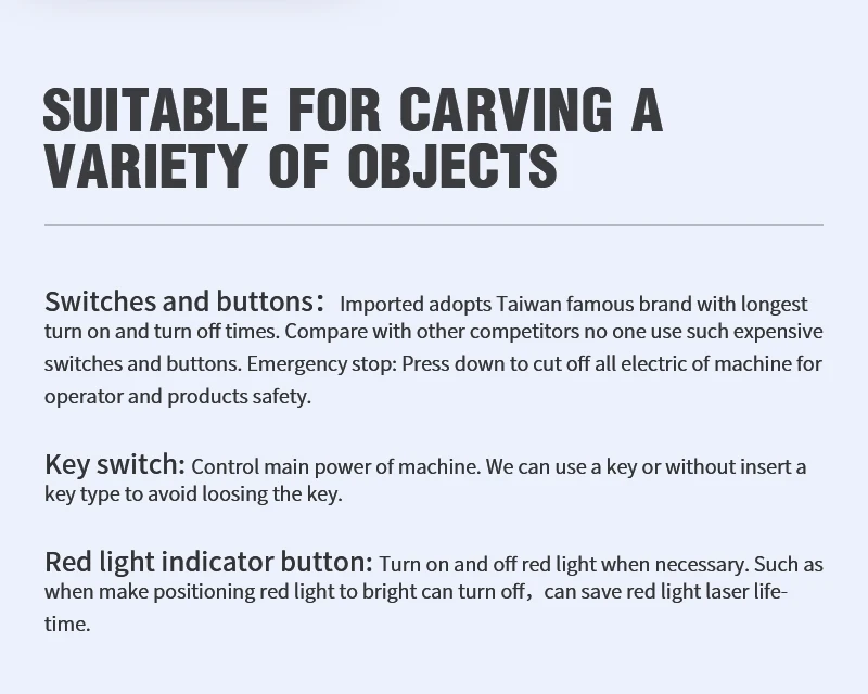 Переключатели и кнопки: импортированные из Тайваня известные бренды с самым длинным временем включения и выключения. По сравнению с другими конкурентами никто не использует такие дорогие переключатели и кнопки. Аварийная остановка: нажмите вниз, чтобы отрезать все электрические машины для безопасности оператора и продуктов. Клавишный переключатель: Управление основной мощностью машины. Мы можем использовать ключ или без вставки типа ключа, чтобы избежать потери ключа. Красный светильник Кнопка индикатора: включить и выключить красный светильник при необходимости. Например, когда вы делаете позиционирование красный светильник яркий может выключить, может сохранить красный светильник срок службы лазера.