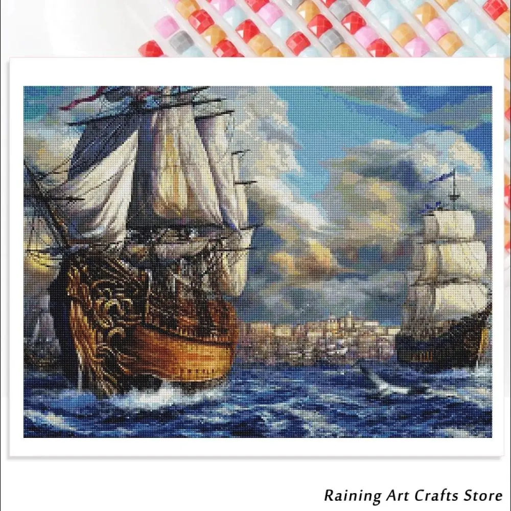 Алмазная 5D картина сделай сам, вышивка с морским парусником, полная круглая выкладка, наборы для вышивки крестиком, мозаичные картины, домашний декор, подарок