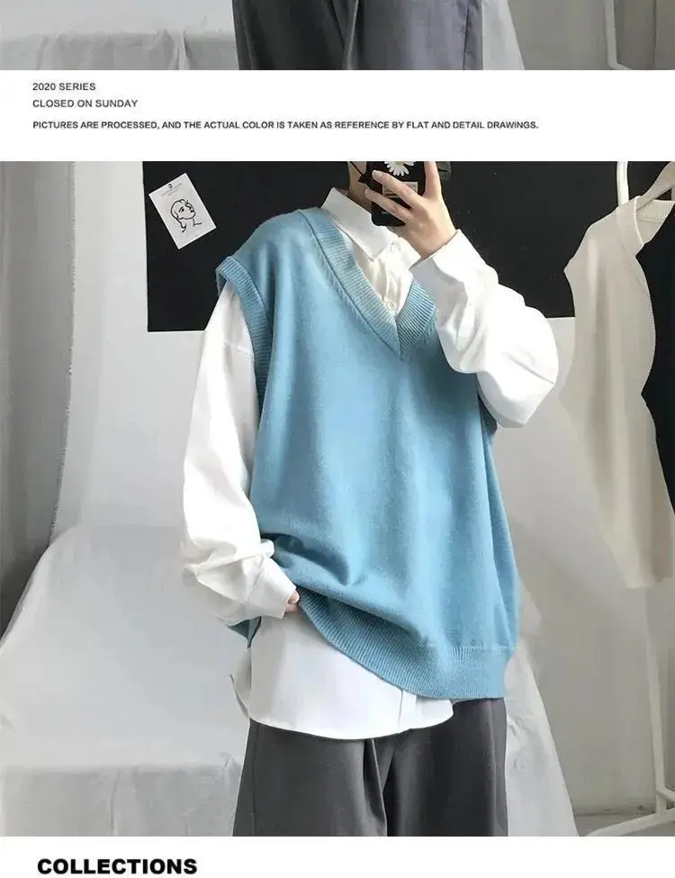 Мужской свитер без рукавов, однотонный вязаный жилет, в Корейском с...