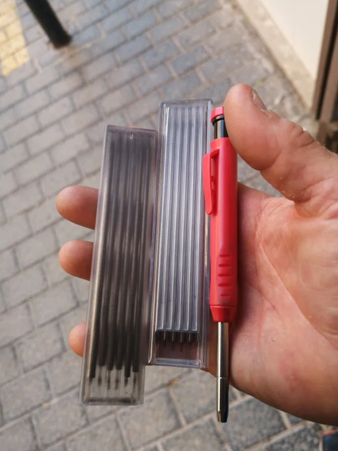 Для тех,кто занимается деревообработкой,данный механический карандаш самое то,что надо. Корпус карандаша твердый, диаметр стержня приличный,встроенная точилка,стержни в специальной упаковке, дополнительных стержней надо заказать,дошло все хорошо.Кстати,хорошая идея ( на мой взгляд) для подарка тому,кто занимается столярно - плотницким делом.