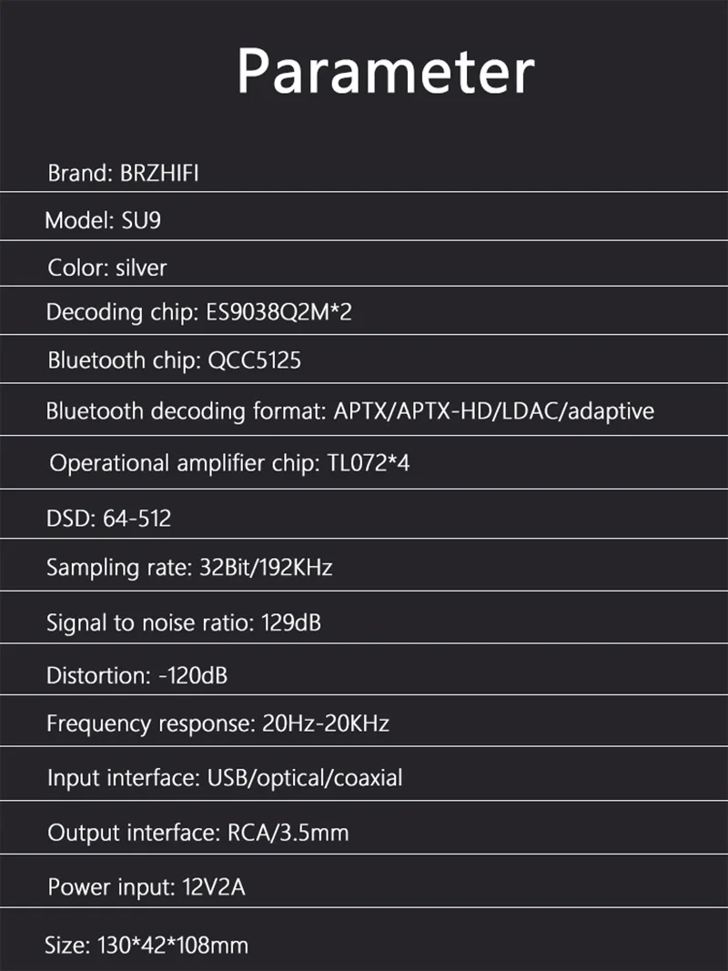 Код извлечения: 2333 Основные характеристики: 1. Он принимает QCC5125, более новое поколение чипов Bluetooth 5,0, чем CSR8675, и поддерживает LDAC + APTX-HD + aptx-adaptive.2. Поддержка 192K 24Bit и DSD аудио формата. Совместим с Bluetooth 4,0-5,0 входом.3. Поддержка коаксиального, оптического волокна, USB, Bluetooth входа.4.OLED низкомощный дисплей высокой четкости, поддержка дистанционного управления.5. Двухъядерный ES9038Q2M значительно улучшил детали и разрешение, чем одноchip ES9038Q2M. Спецификация: Модель: DAC-SU9Вход: коаксиальный, оптический, USB, BluetoothАдаптер питания: 12 В постоянного тока (1-2A)Выходной интерфейс: выход RCA, 3,5 стерео разъем для наушниковРазмер печатной платы: 109 мм * 163 мм * 62 ммРазмер изделия: 132*42*109 мм Посылка: 1 * DAC-SU91 * Bluetooth АнтеннаАдаптер 1 * 12V2A1 * пульт дистанционного управления1 * USB(Только для версии USB)