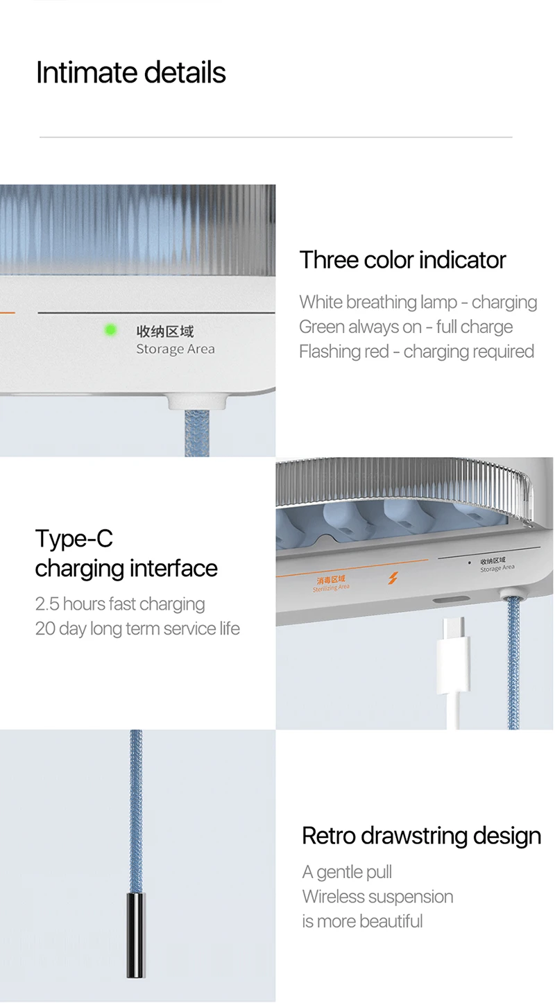 * UVC-LED безопасная стерилизация, скорость стерилизации до 99.99%. * Потяните веревку, легко управлять, может быть дезинфицирован, потянув его мягко * Может удерживать до 5 зубных щеток для семьи, из которых 3 положения используются для дезинфекции и 2 положения используются для хранения. * Дружелюбный синий световой светильник напоминает вам, чтобы избежать ультрафиолетового излучения. * Встроенный 1000 мА/ч, литий-ионный аккумулятор, зарядка для 2,5 h, используйте в течение 20 дней.