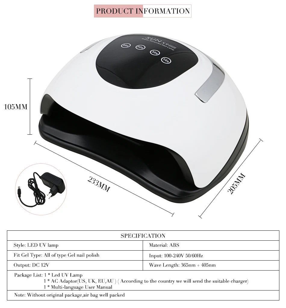 100% новый и высокое качествоНазвание: SUN X7MAXДлина волны: 365 + 405нмМатериал: АБС-пластикРазмер: L230 * W200 * H105 ммСветодиоды: 57Шт УФ/светодиодный бисерТип геля: УФ-гель/светодиодный гельАдаптер: 100-240 В пер. тока, 50/60 ГцВилка: штепсельная вилка EU / AU / US / UK (опционально)Датчик: ручной/автоматический инфракрасный датчикТаймер: 10s/30s/ 60s/ 99s (режим низкого нагрева)Срок службы: более 50000 часовПодходит для: дома и салона