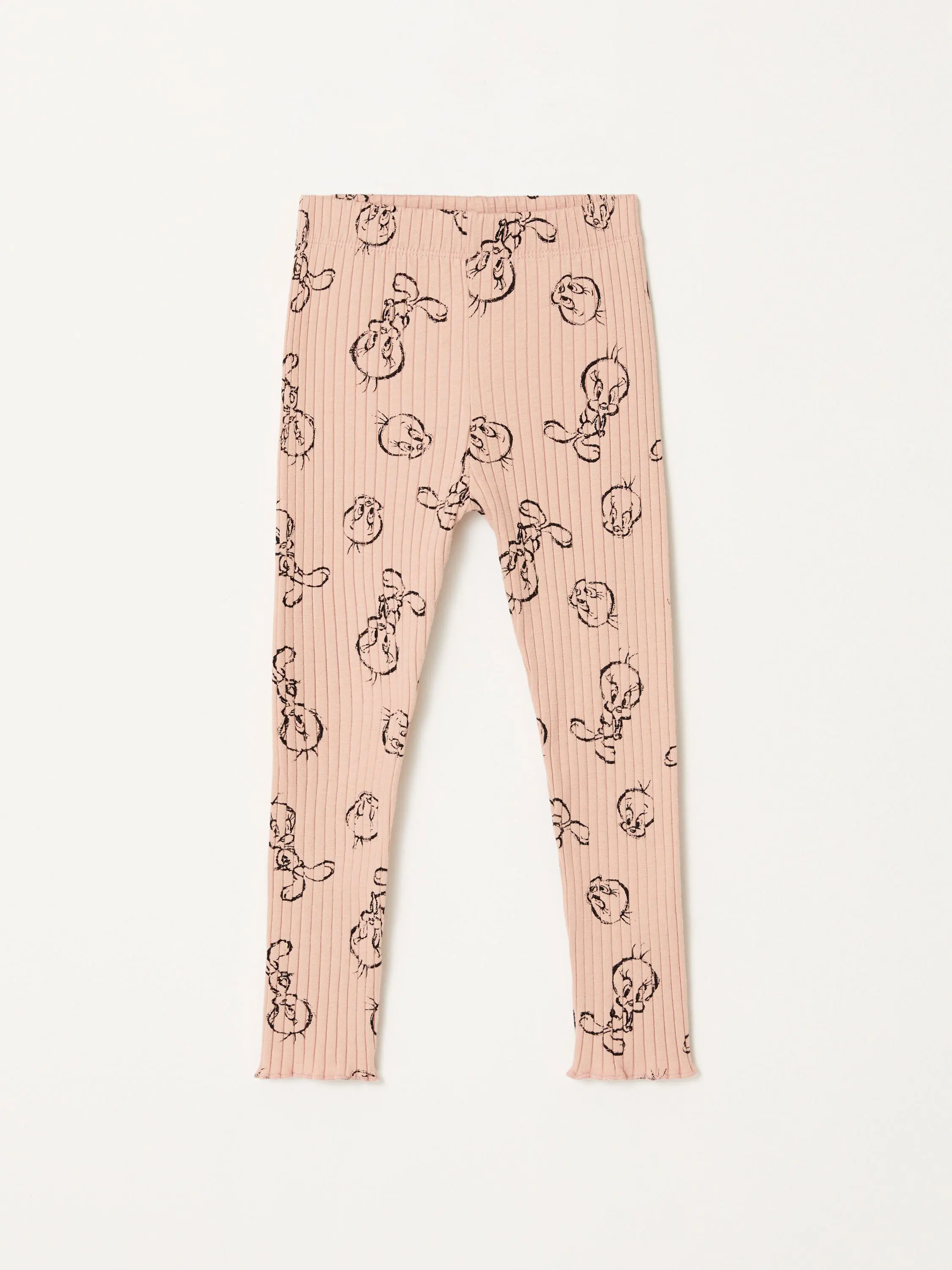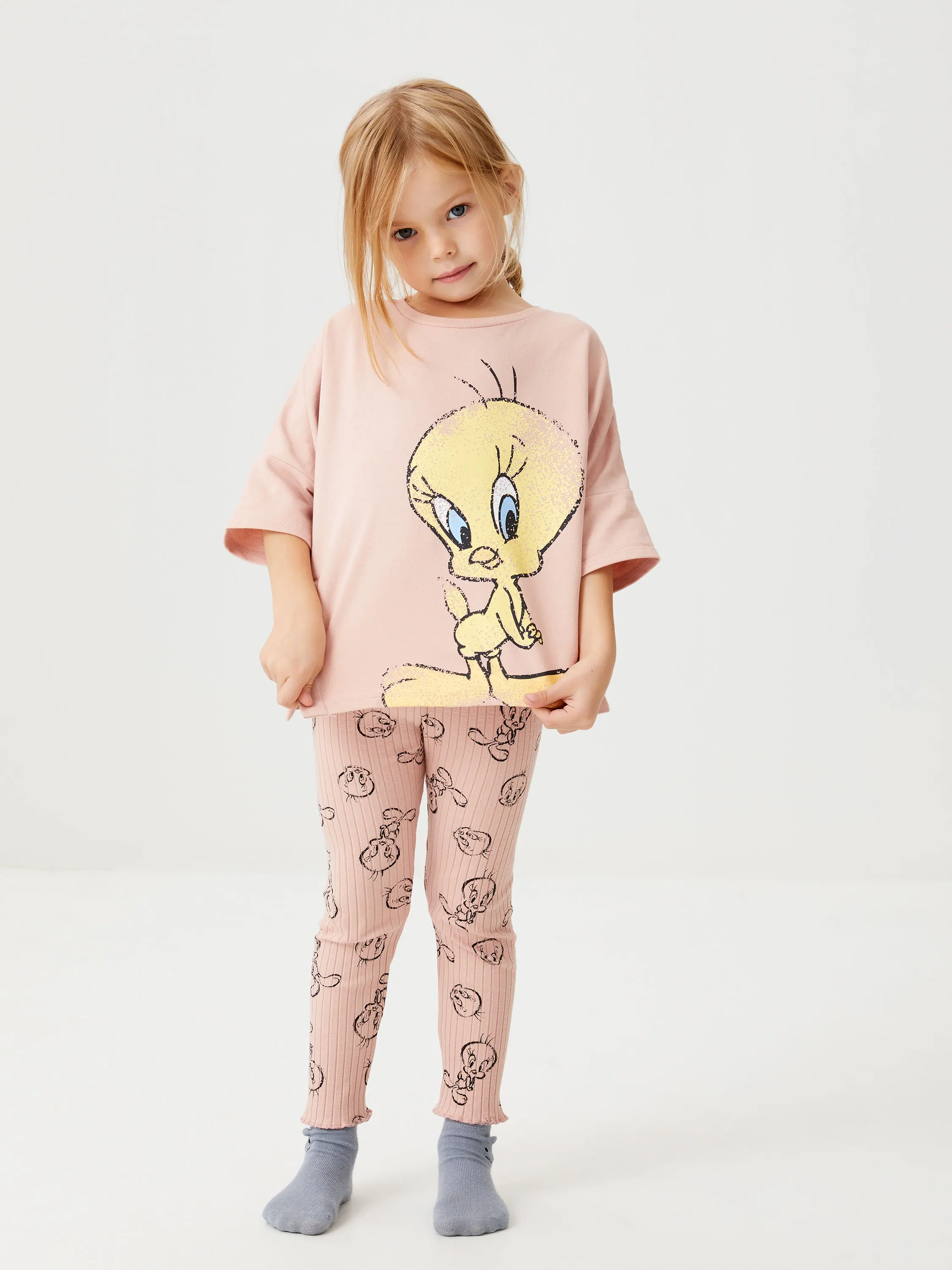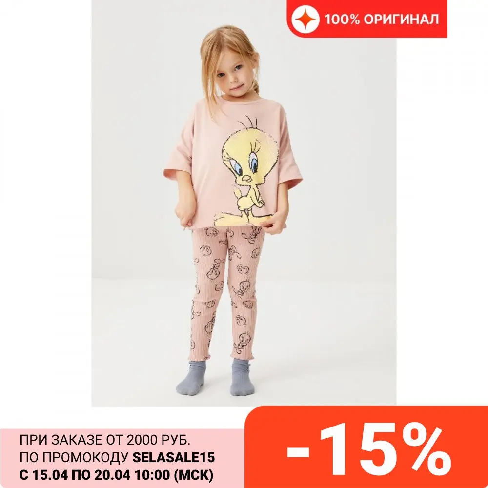 Пижама из специальной коллекции с Warner Bros., изготовленная из мягкого трикотажа на основе хлопка, которая хорошо пропускает воздух, слегка растягивается и не сковывает движения. Модель состоит из футболки с избыточным весом и леггинсов по подолу. Футболка с круглым вырезом, заниженной линией плеч и короткими рукавами. Акцентная деталь в виде выреза сбоку. Леггинсы с высокой талией на эластичной резинке и фигурной окантовкой внизу брюк. Модель украшена лицензированным принтом «Looney Tunes».