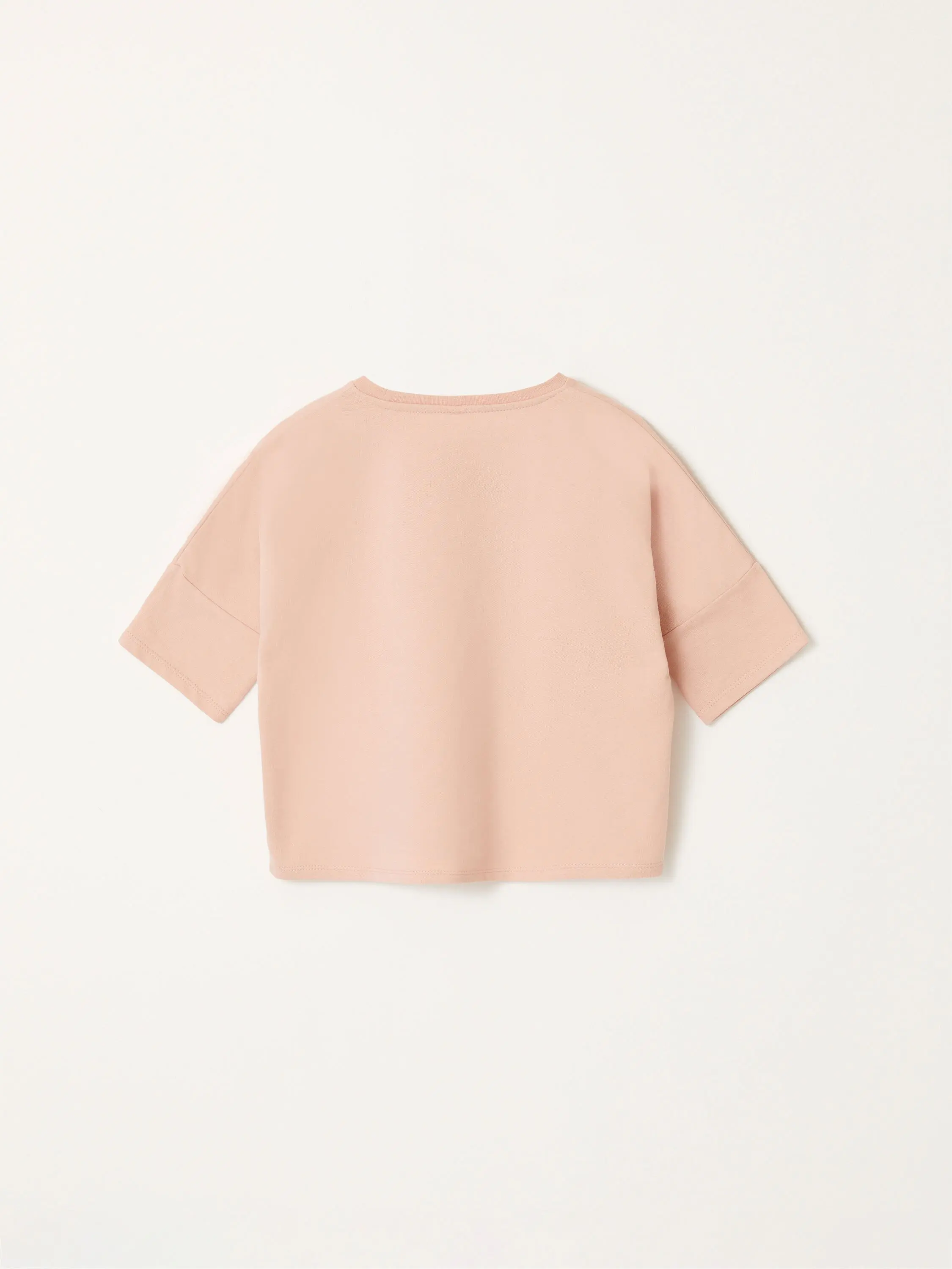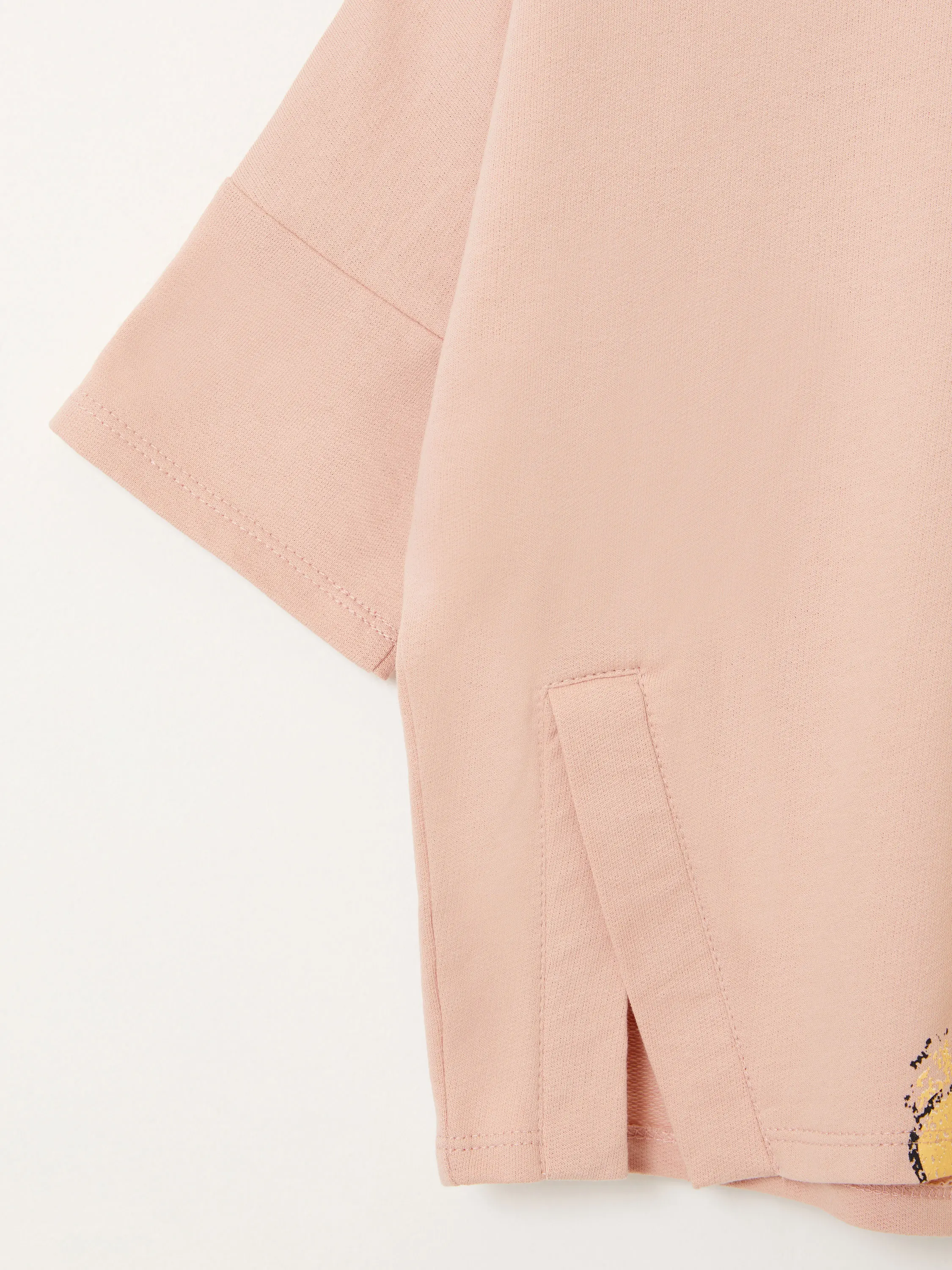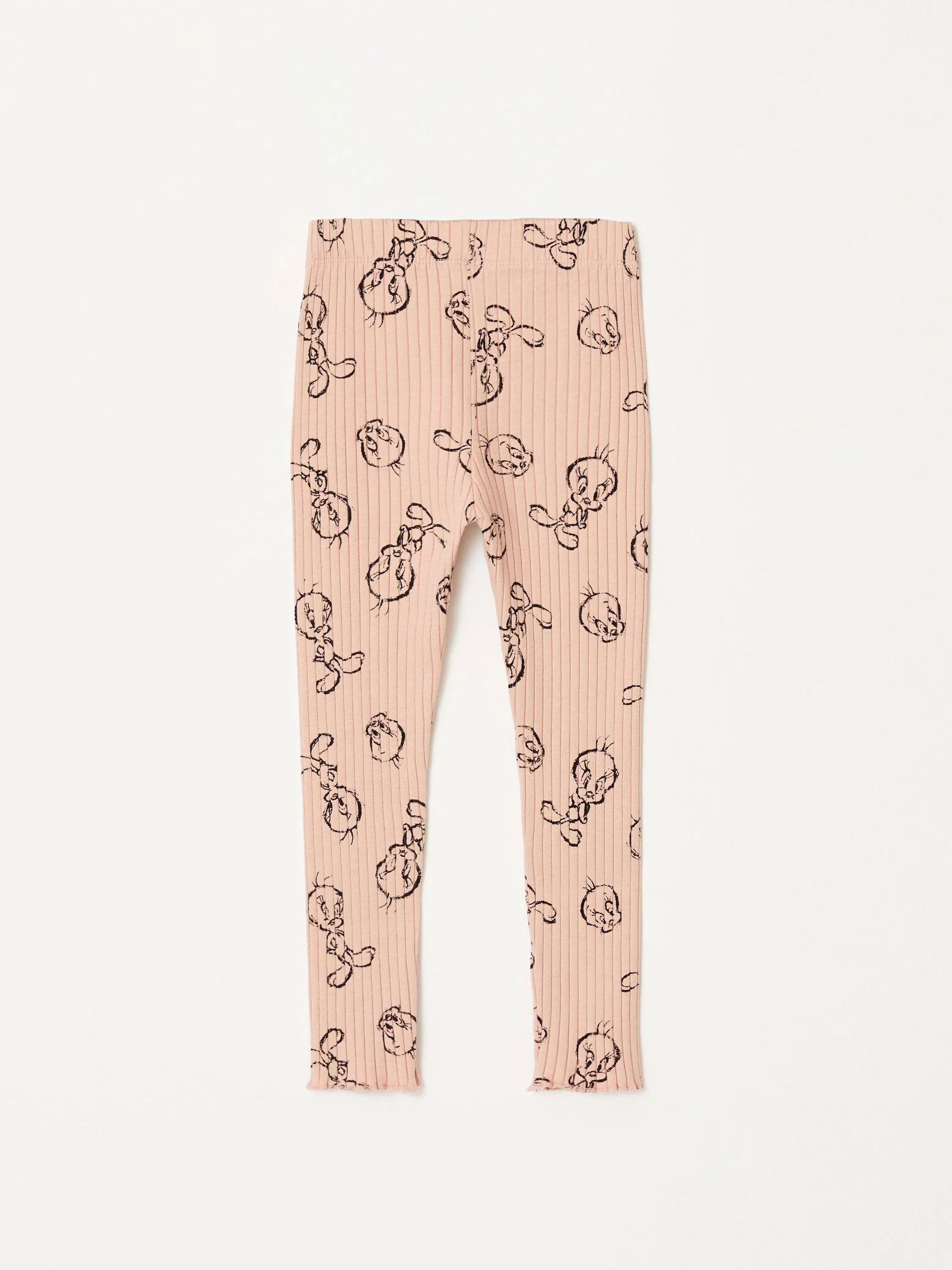 Пижама из специальной коллекции с Warner Bros., изготовленная из мягкого трикотажа на основе хлопка, которая хорошо пропускает воздух, слегка растягивается и не сковывает движения. Модель состоит из футболки с избыточным весом и леггинсов по подолу. Футболка с круглым вырезом, заниженной линией плеч и короткими рукавами. Акцентная деталь в виде выреза сбоку. Леггинсы с высокой талией на эластичной резинке и фигурной окантовкой внизу брюк. Модель украшена лицензированным принтом «Looney Tunes».