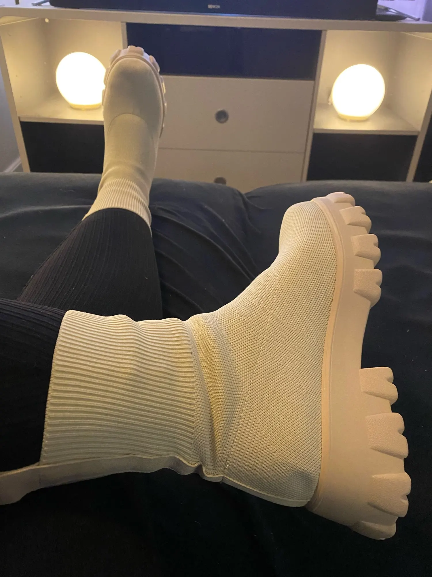 The boots look accurate to the pictures and are about what I was expecting to receive. The style seems inspired by Balenciaga looks but I'm pretty sure they're not a dupe or rep of any particular shoe. I'm a US size 7.5/8 and I ordered a 39, but I definitely could have gone up a size as my toe reaches the end of the shoe. However, the upper ankle part still has room so it's not too tight, and I think I would even be ok wearing thick socks with these. The fabric is strechy and I think it would fit different sized legs. The sole is pretty soft material but I think they still seem comfy enough to walk around in. You can see some of the glue marks around the seam but I saw this in another review so I was expecting it. Cute and nice enough for the price!
