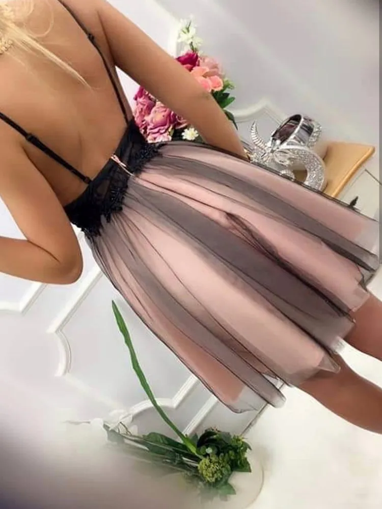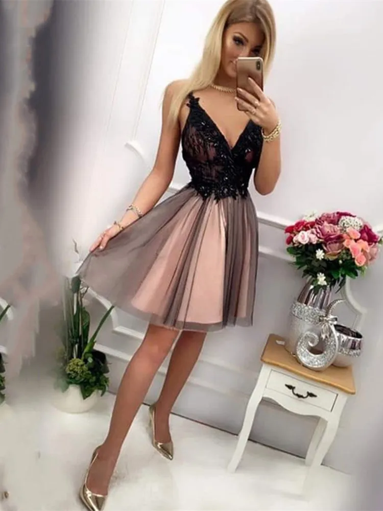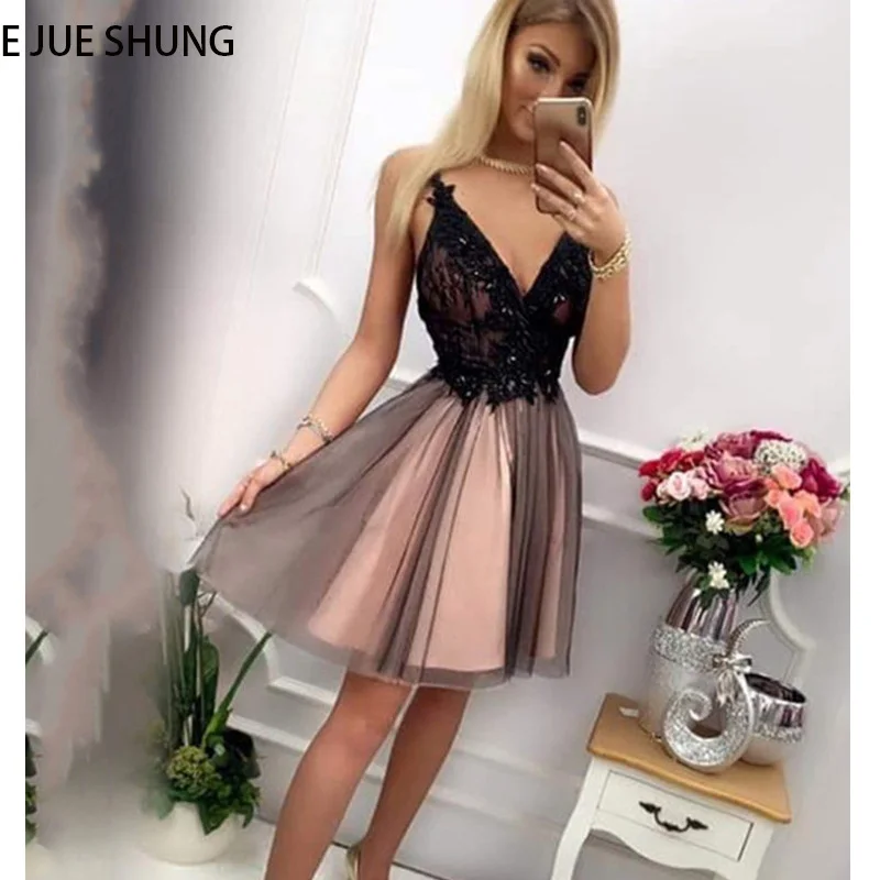 Короткие кружевные платья для встречи выпускников E JUE SHUNG цвета шампанского и черного цвета Короткие вечерние платья на тонких бретельках с открытой спиной для выпускного вечера