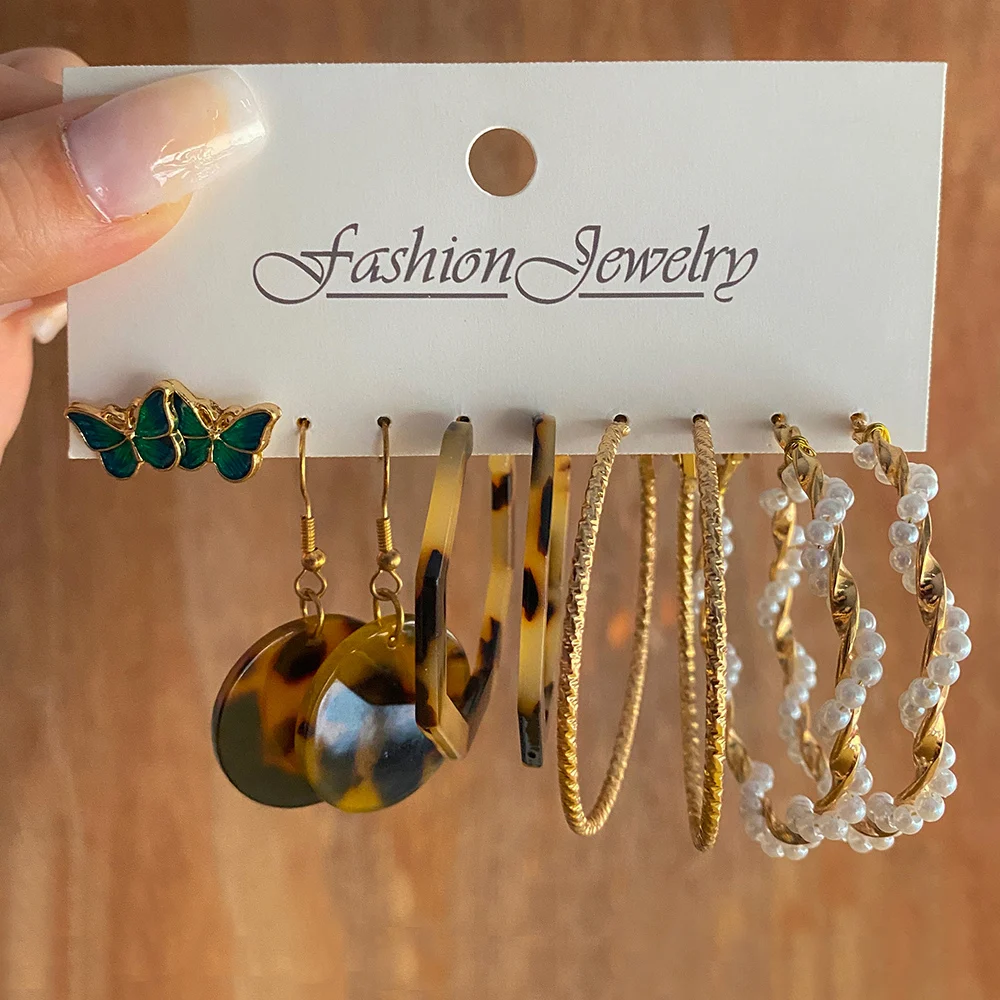 KISSWIFE Серьги-кольца в стиле панк с леопардовым принтом и акриловой смолой, набор для женщин, модные золотые серьги-кольца с бабочкой и жемчугом, подарки, ювелирные изделия