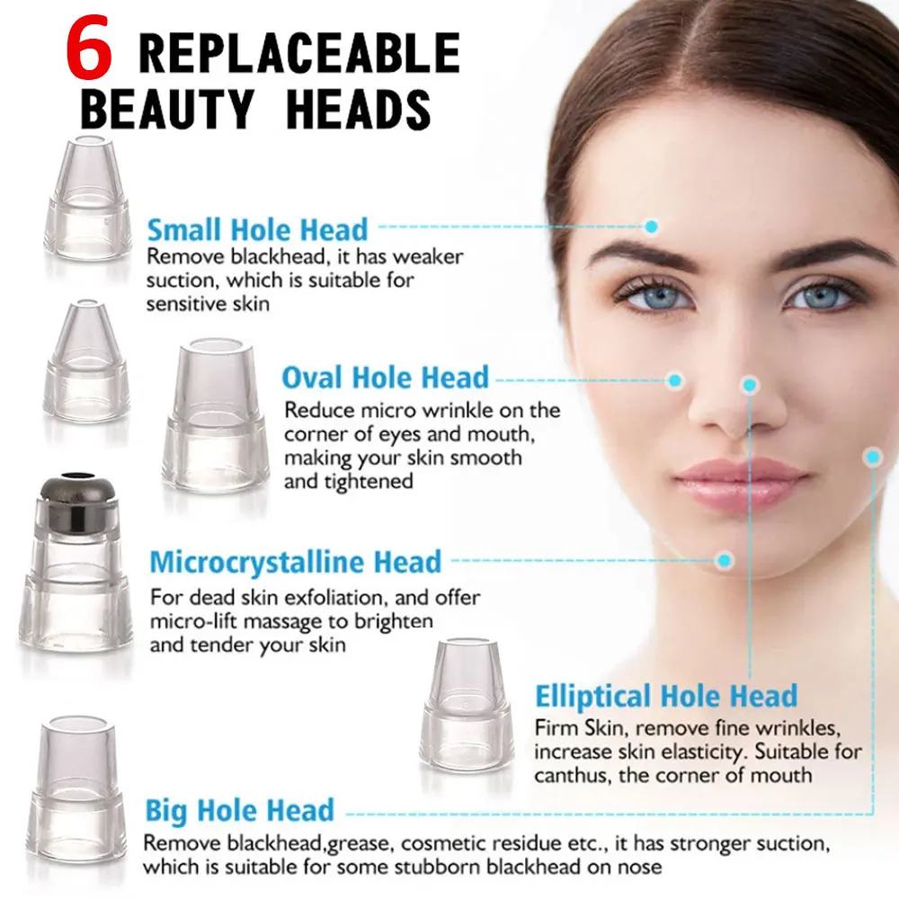 1: сочетание черных точек + увлажняющий спрей для удаления грязи и очистки кожи2: гладкая и омолаживающая кожа: тонкая кристальная головка может мягко удалить стареющую кожу и сделать кожу мягкой и гладкой:3: затяните v-образную поверхность: Вакуумные бомбы для подъема и затягивания кожи, улучшения двойного подбородка и достижения v-образной формы лица4: всасывающие Угри: сильное поглощение черных точек от кожи, масла, грязи и т. д. для очистки кожи5: выцветание тонких линий: подтяните и массируйте кожу, чтобы повысить жизненную силу и уменьшить тонкие линии6: Увлажняющий инструмент: смягчает сухость кожи, увлажняет нижнюю часть кожи