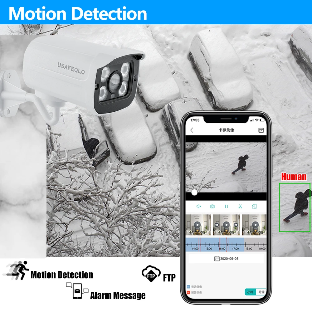 Обнаружение движения и оповещение по электронной почте и сигнал тревогиКогда кто-то врезается в область съемки, камера издает сигнал тревоги, а сообщения тревоги будут подталкиваться к вашему телефону.