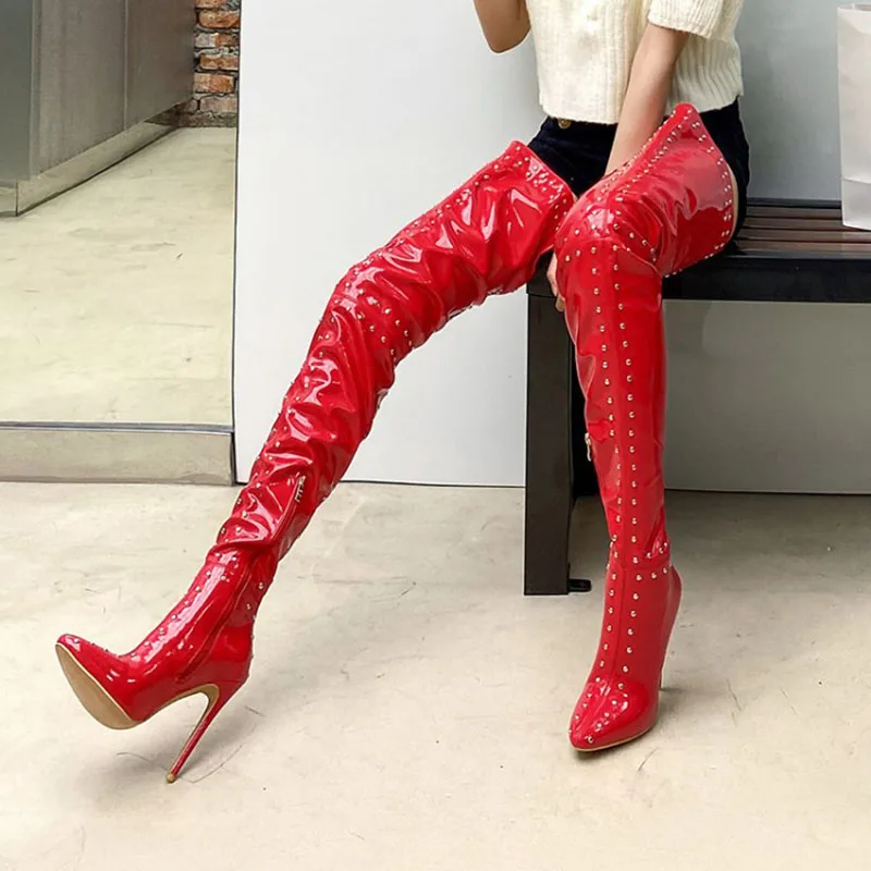 Женские сапоги выше колена, красные, белые лакированные сапоги до бедра из лакированной кожи на высоком каблуке, со стальными вставками, Осень-зима 2021