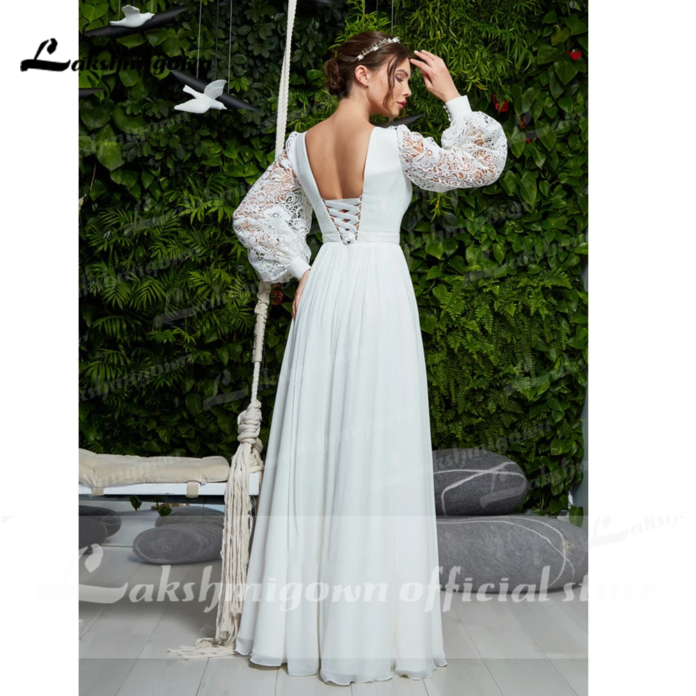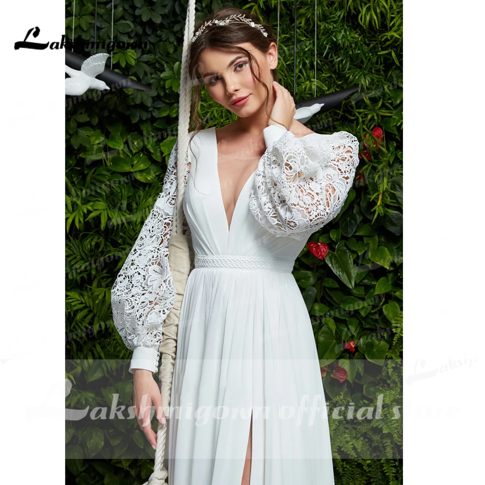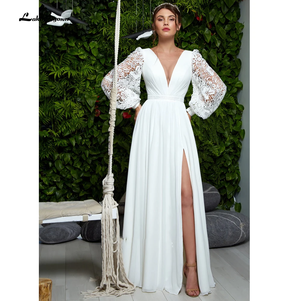 Женское свадебное платье с разрезом, белое шифоновое кружевное платье с длинными рукавами и V-образным вырезом