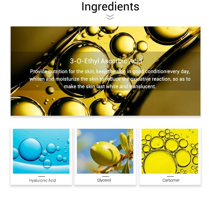 > Уменьшение меланинаПроизводит реакцию между высокой концентрацией экстракта VC и меланином, минимизирует меланин на светильник пигмента> ОтбеливаниеСодержит богатый VC, эффективно осветляет вашу кожу, устраняя пигменты меланина> Всесторонняя защитаТщательно улучшает способность восстановления кожи, чтобы предотвратить повторное появление упрямых веснушек> Ремонт поврежденной кожиВосстанавливает кожу от солнечных ожогов и других проблем, таких как шелушение, вызванное длительным неправильным лечением
