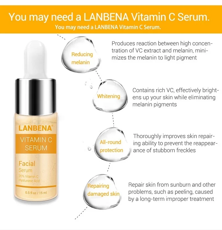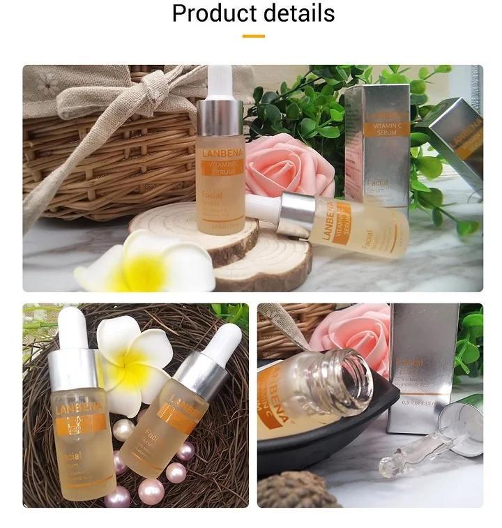 Название продукта: сыворотка витамина C LANBENAХарактеристики: 0,5 унций (15 мл)Эффекты: богатый vC, этот продукт имеет эффективное отбеливание и удаление веснушек, что делает его способным осветлить и увлажнить кожу, удалять пятна и веснушки.