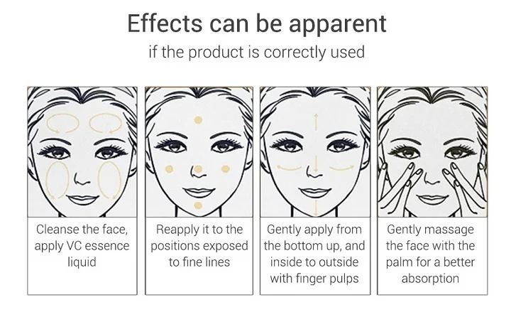 Если продукт правильно используется1. Очистите лицо, нанесите жидкость эссенции VC2. Повторно применить его к позициям, подверженным воздействию линий3. Мягко наносите снизу вверх и внутри на улицу с помощью пальчиковых импульсов4. Мягко массируйте лицо ладонью для лучшего поглощения