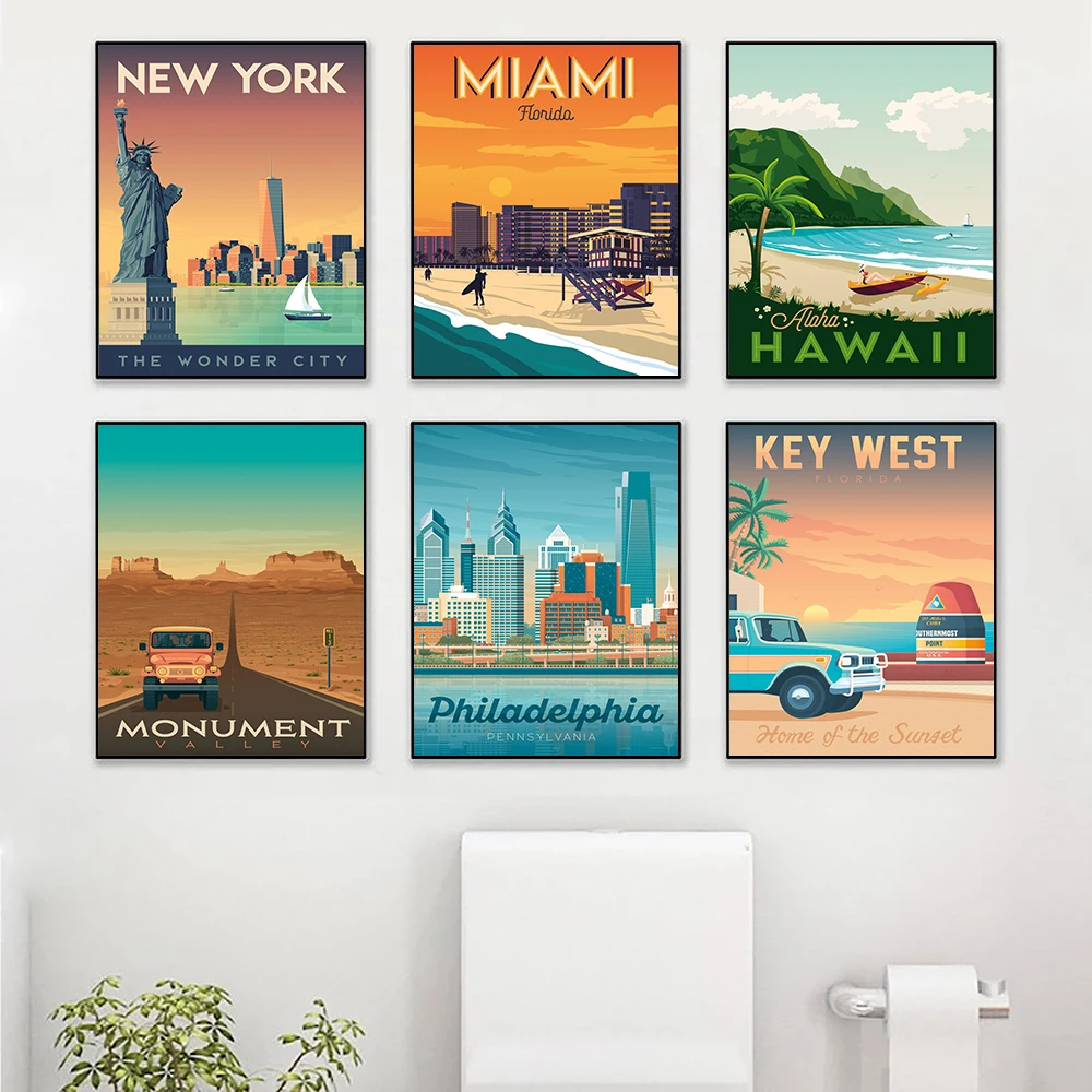 Винтажный постер в скандинавском стиле для путешествий и городов, Нью-Йорк, Гавайский пляж Майами, памятник, пейзаж, живопись на холсте, настенные картины, домашний декор
