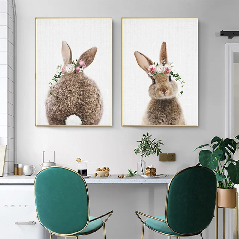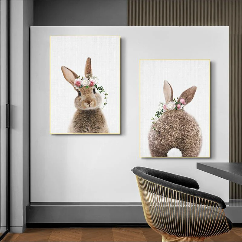 Картина с кроличьим кроликом и хвостом, картина на стену, цветок, животное, холст, постер с принтом, детская картина, скандинавский Декор для комнаты для маленьких девочек