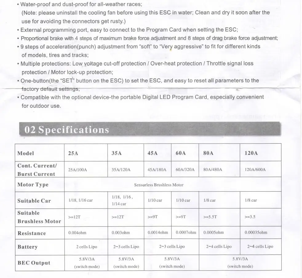45A Спецификация ESC:Непрерывный ток: 45AТок разрыва: 180AБатарея: 2-3S Li-Po / 4-9S Ni-MH Ni-CdBEC Выход: 5,8 V / 3AШтепсельная Вилка источника питания: штепсельная вилка T60A характеристики ESC:Наименование товара: водонепроницаемый ESCПродолжительный ток: 60AТок разрыва: 320AБатарея: 2-3S Li-Po / 4-9S Ni-MH Ni-CdОЦК выход: 5,8 V / 3AШтепсельные вилки источника питания: штепсельная вилка TВилки двигателя: 4 мм разъем типа «банан»80A характеристики ESC:Продолжительный ток: 80AТок разрыва: 480AБатарея: 2-3S Li-Po / 4-9S Ni-MH Ni-CdОЦК выход: 5,8 V / 3AШтепсельная Вилка источника питания: штепсельная вилка TШтекер двигателя: 4 мм разъем типа "банан"Размер: прибл. 43*31*32 мм/1,7*1,2*1,3 дюймов120A характеристики ESC:Непрерывный ток: 120AТок разрыва: 480A / 10 секАккумулятор: 2-4s LiPo / 4-12s NiMhВыход BEC: 5,3 В/5A (режим переключения)Разъем питания: T штекерШтекер двигателя: гнездо 5 ммРазмер: прибл. 43*31*32 мм/1,7*1,2*1,3 дюймовПрограммирующая карта для радиоуправляемого автомобиля ESC Бесщеточный электронный регулятор скоростиОсобенности:Светильник весПростота в использованииПортативный дизайнПрограммирующая карта для радиоуправляемого автомобиля ESC Бесщеточный электронный регулятор скорости, которыйСпециально разработан для бесщеточного электронного контроллера скорости, продаваемого в нашем магазине.Характеристики:Низкое напряжение отрезать: 3,1 V/Cell 2,8 V/Cell 3,3 V/Cell без отрезнойРежим запуска: средний, мягкий, прочныйМаксимальная Тормозная сила: 25%, 50%, 75%, 100%Максимальная обратная сила: 25%, 50%, 75%, 100%Нейтральный диапазон: 6%, 9%, 12%, рабочее состояниеПосылка включает:1 шт. 45A /60A/80A/120A или программатор (по вашему выбору)Примечание: Эти ESC поддерживают только двигатель 3650.