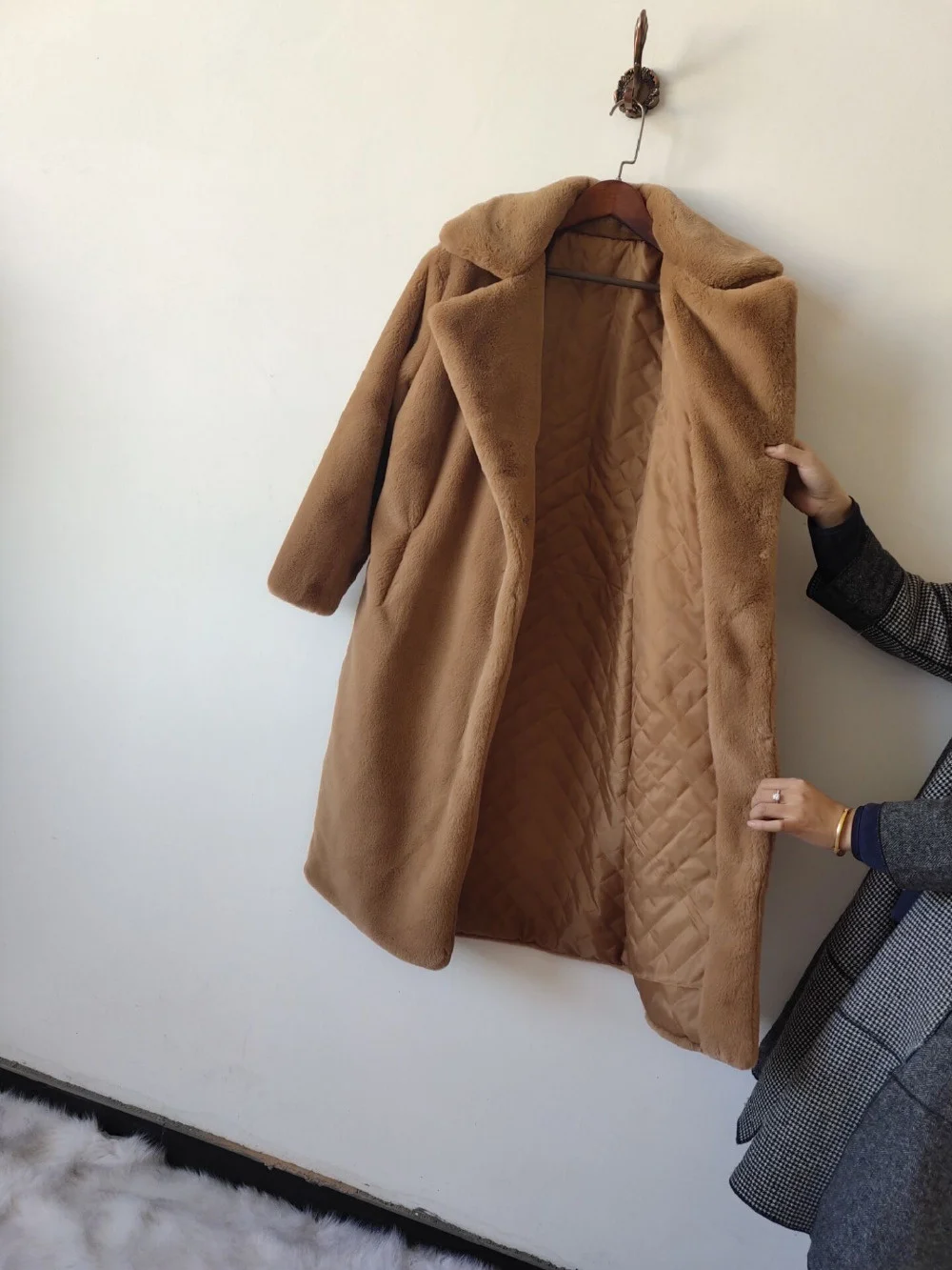 Зимнее теплое женское высококачественное пальто из искусственного кроличьего меха, роскошное длинное меховое пальто, Свободное пальто с лацканами, толстые Искусственные женские плюшевые пальто