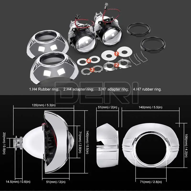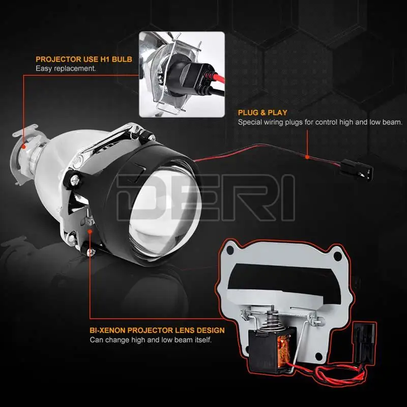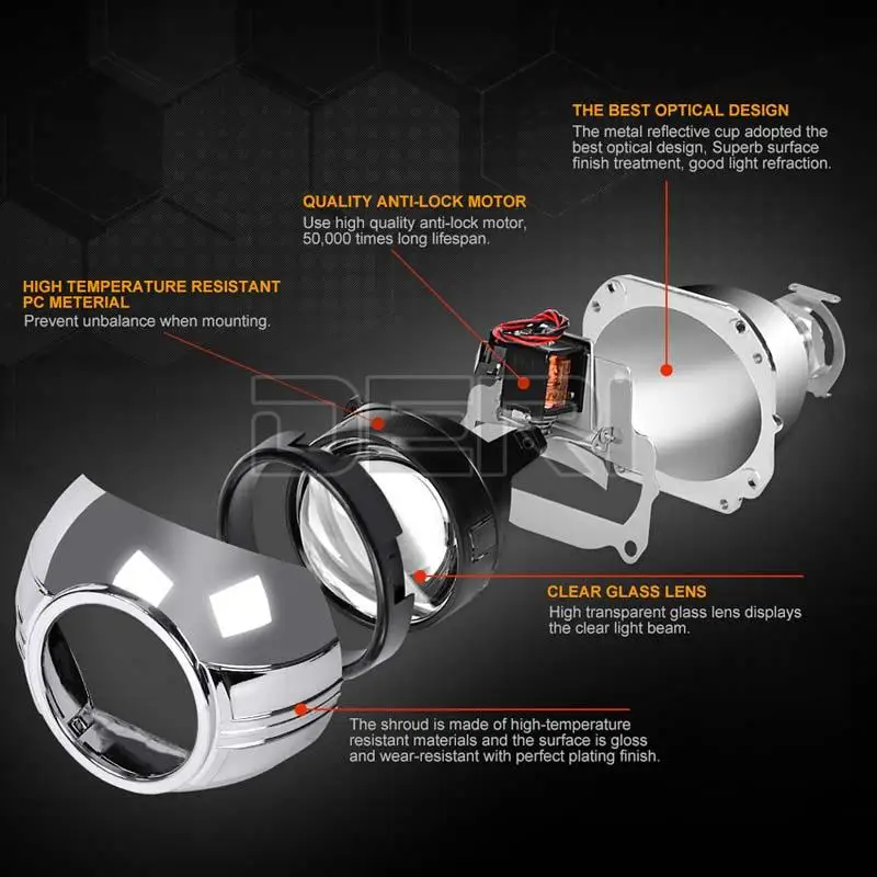 О: этот объектив проектора может установить ксеноновую HID лампу, а также может поместиться светодиодный светильник серии DERI A7.
