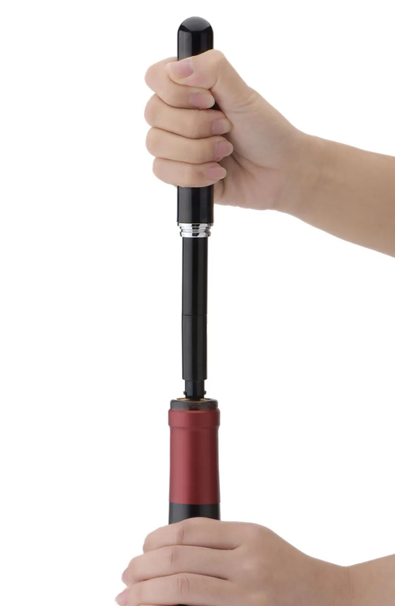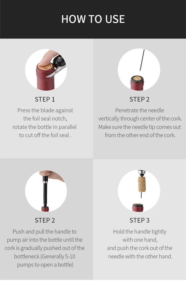 Креативная бутылка с воздушным давлением открывалка принимает принцип воздушного давления, чтобы прокачивать воздух в бутылку через небольшую иглу для увеличения давления воздуха в бутылке, И используйте внутреннюю и внешнюю разницу давления, чтобы полностью вытолкнуть пробку.