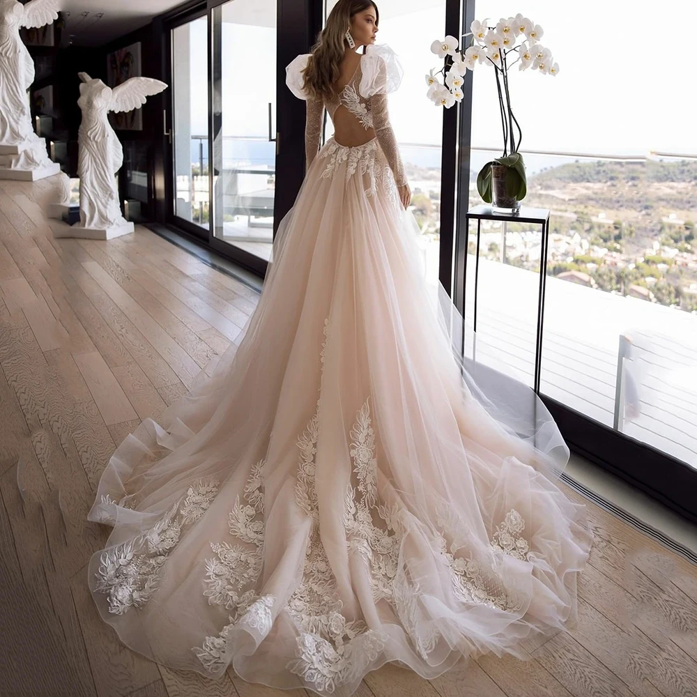 UZN Chic Champagne Princess Lace and Tulle Modern Wedding Dresses Sweetheart Long Puffy Sleeves Glitter Bride Gowns Plus Size Wedding Gowns
