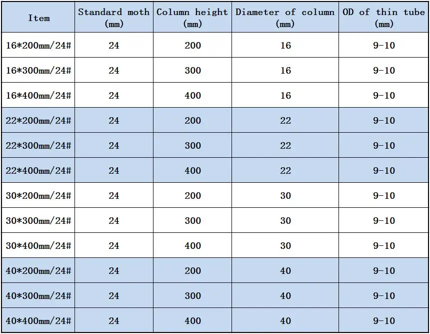 Изделие: колонна Хроматографии с сердечником песка (с поршнем из ПТФЭ)Материал: высокое боросиликатное стеклоХарактеристики: фильтр с песком прикрепляется к нижней части трубки для облегчения заполнения адсорбентов, таких как глинозем. Поршень сваривается между нижним концом и тонкой стеклянной трубкой для управления удержанием или для разрядки жидкости.Применение: для лабораторного разделения и очистки.