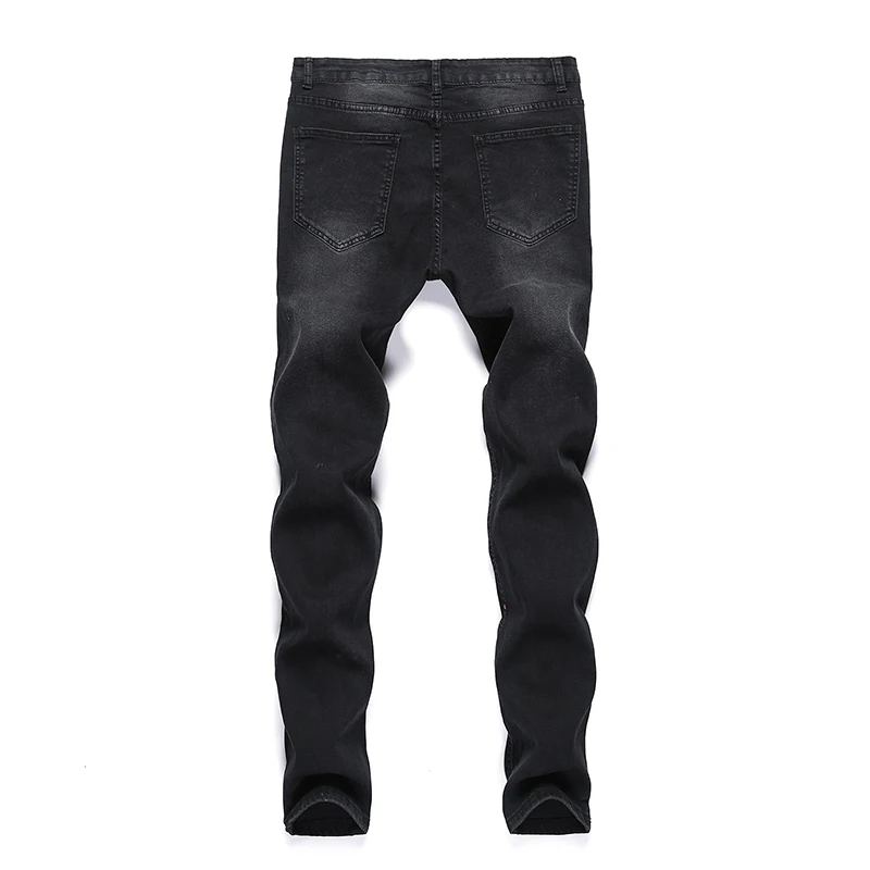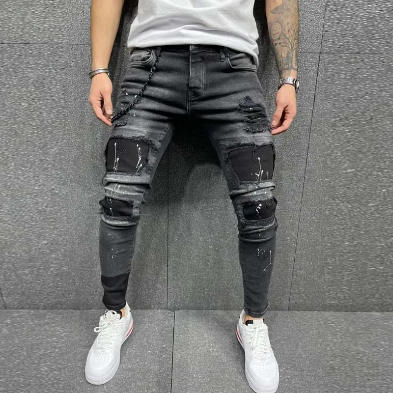 Джинсы мужские рваные зауженные с принтом, байкерские брюки-карандаш в стиле хип-хоп, повседневные брюки из денима в стиле пэчворк