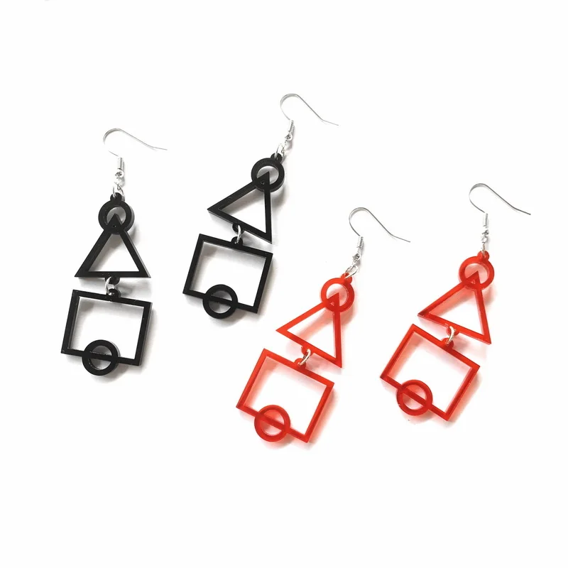 Трендовые Сережки для игры в кальмары, сериалы, круглые треугольные квадратные сережки с черным и красным логотипом, геометрические акриловые Висячие серьги для женщинМатериал: акрилРазмеры: 2,4*5,6 смPS: Мы можем настроить любой дизайн и цвет (для настройки, пожалуйста, свяжитесь с нашей службой поддержки клиентов)