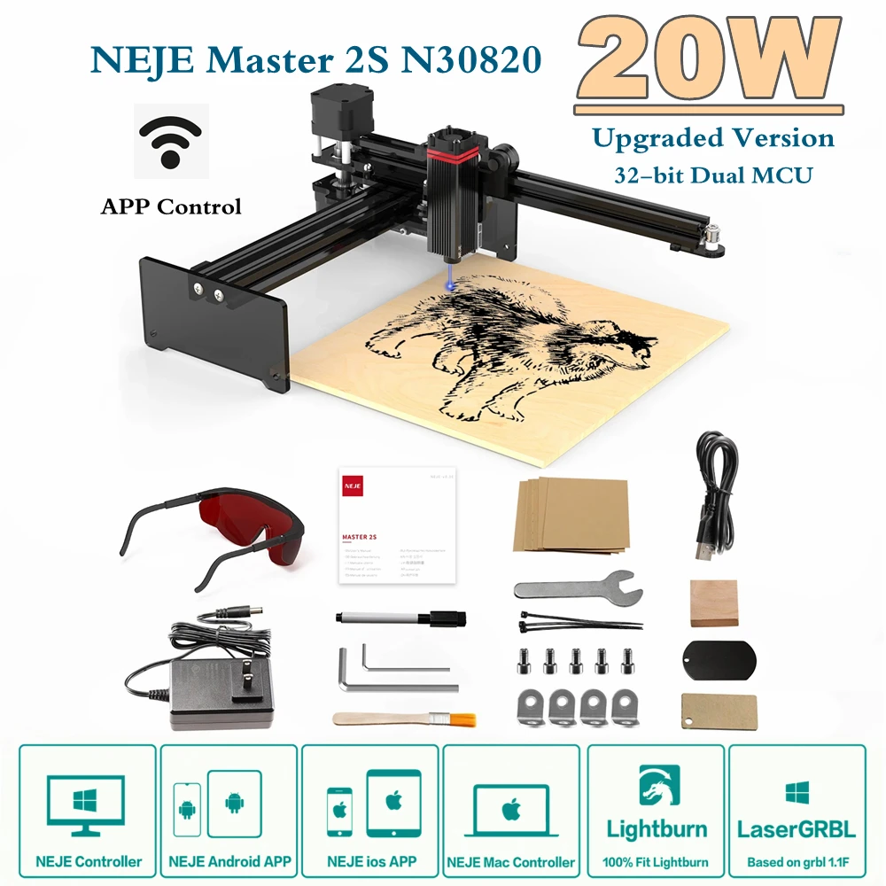 Программное обеспечение: приложение NEJE для Android, беспроводное приложение NEJE для iOS / macOS, программное обеспечение NEJE для windows, Benbox, LaserGRBL с прошивкой GRBL1.1f., программное обеспечение LightBurn с прошивкой GRBL1.1f.