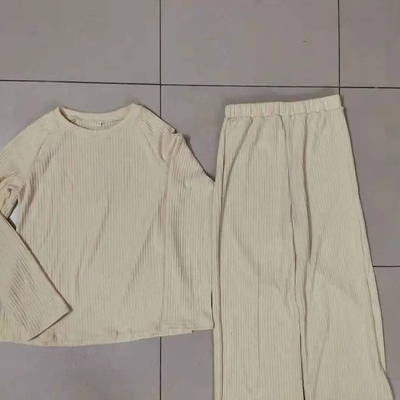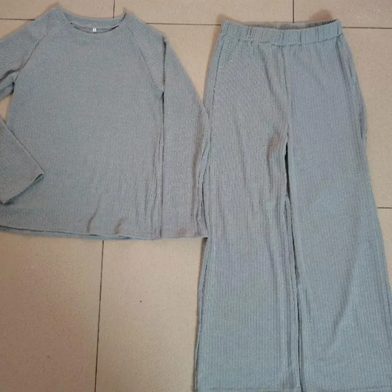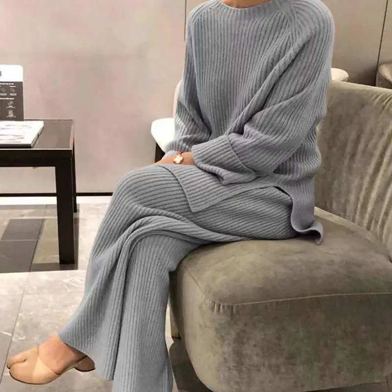 Топ с широкими штанинами комплект из двух предметов, комплекты со свитером повседневная трикотажная одежда с длинными рукавами и круглым вырезом в Корейском стиле