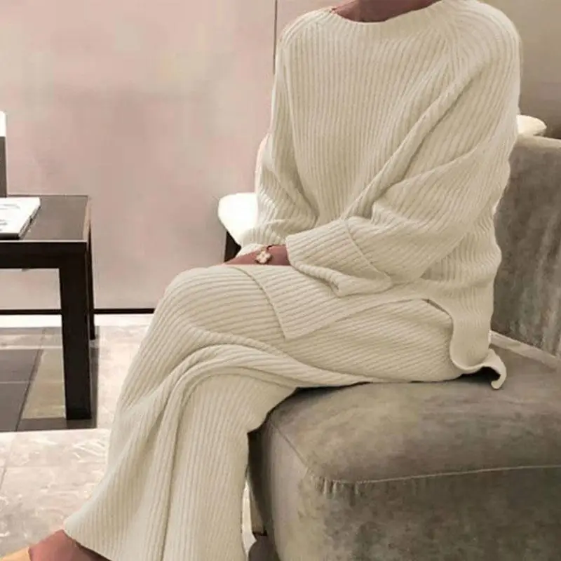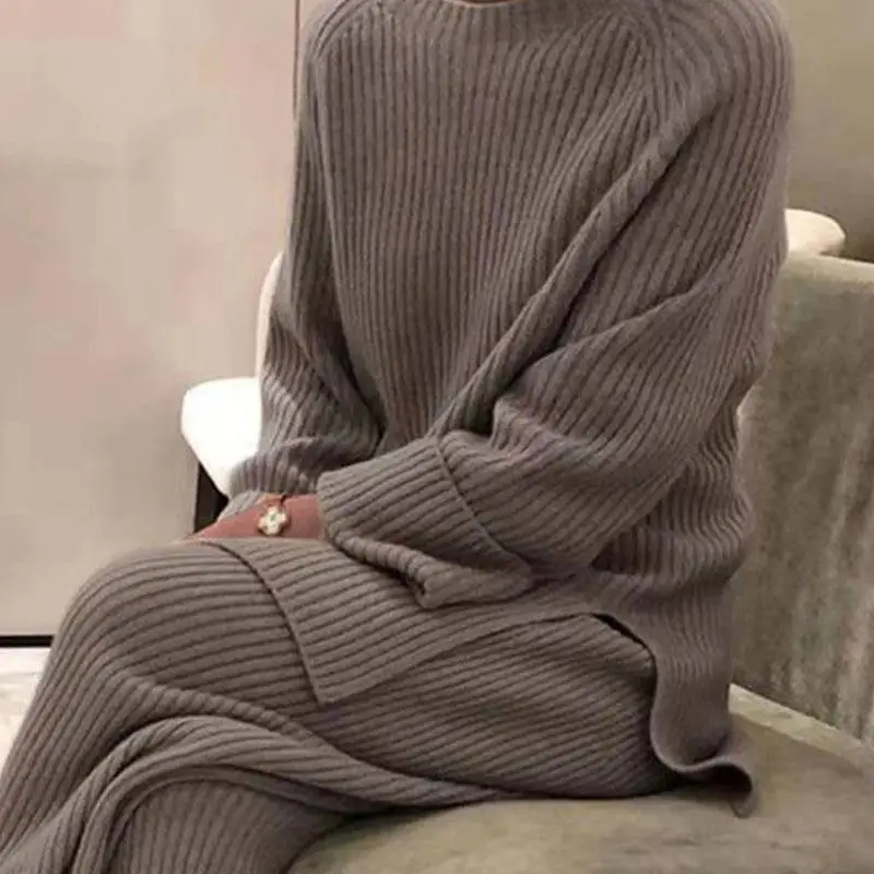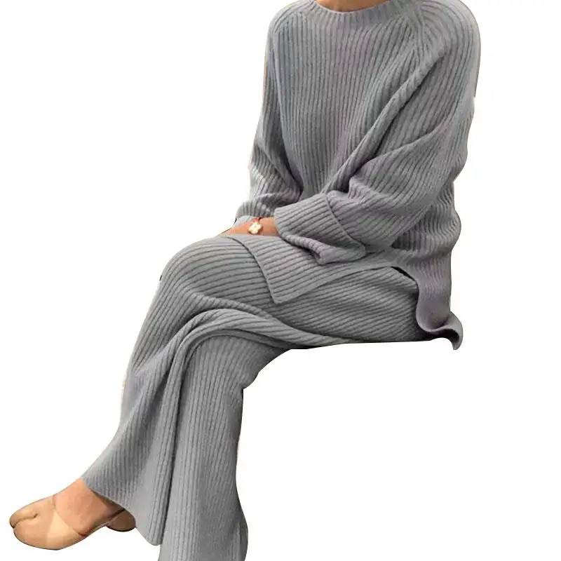 Женский трикотажный повседневный костюм из двух предметов, свитер с широкими штанинами и круглым вырезом, однотонный зимний костюм с капюшоном и длинными рукавами