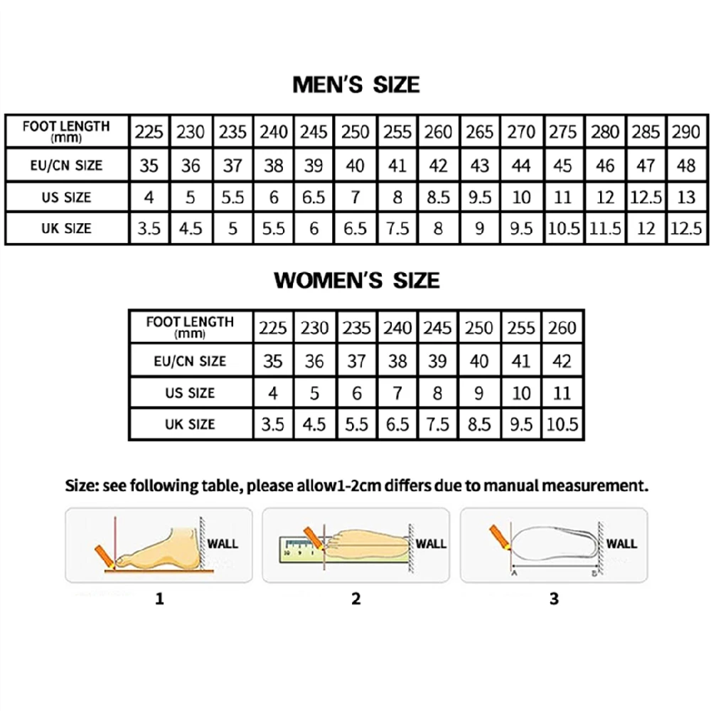 У разных туфель разные размеры, пожалуйста, выберите размер с длиной стопы. Для при заказе указывайте размер и цвет могут быть погрешности в диапазоне 0,3-0,5 см ошибки из-за различных методов измерения.Если у вас широкая или толстая одежда, пожалуйста, выберите на один размер больше. Если вы не уверены в своем размере, пожалуйста, свяжитесь с нами перед оплатой.