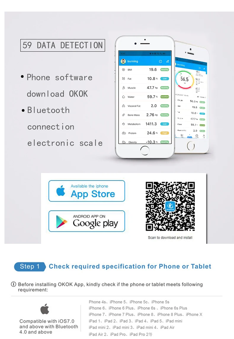 *Skeletal Muscle Rate measurement*Body mass index (BMI) measurement*muscle measurement*moisture measurement*subcutaneous fat measurement*visceral fat measurement*protein measurement*calorie measurement*bone mass measurement*body type measurement*normal weight measurement*weight without fat measurement* body weight measurement-BMI Reference-Touch-button