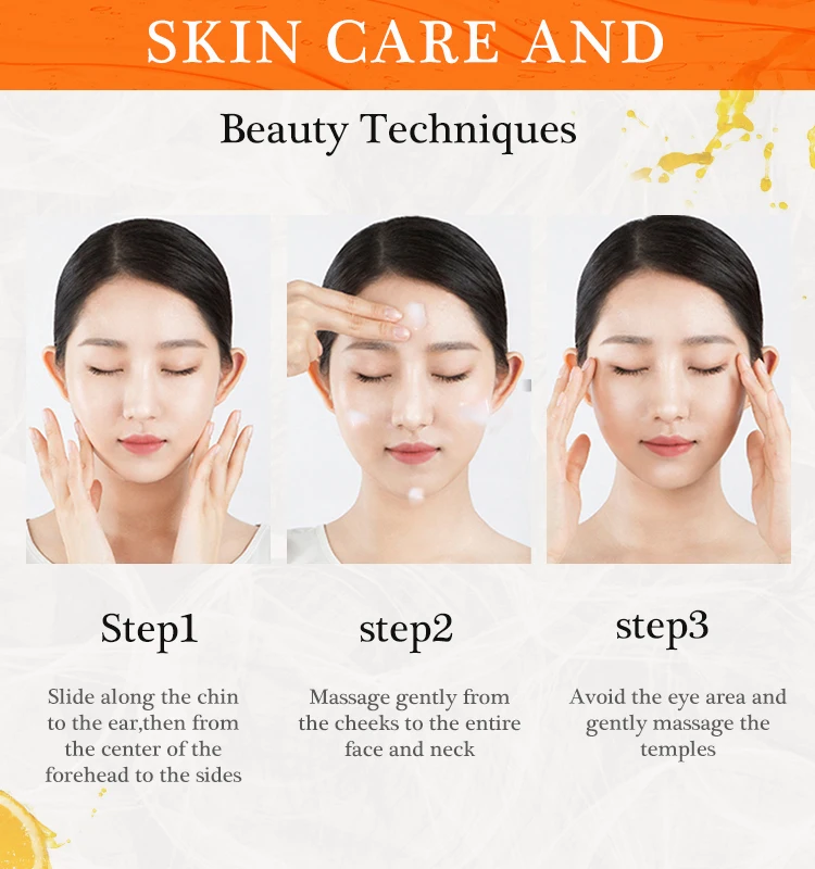 Советы по использованию:1. Очистите и высушите кожу днем и ночью.• 2. Нанесите соответствующее количество витамина С на кожу лица и шеи.□ 3. Массируйте мягко, пока он полностью не впитывается.⑤ 4. Используйте день и ночь для достижения лучших результатов.