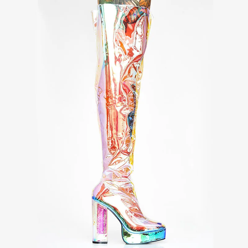 Сапоги до колена, новинка, яркие прозрачные модные женские сапоги на толстом каблуке, крутые сапоги на высоком каблуке, в европейском и американском стиле